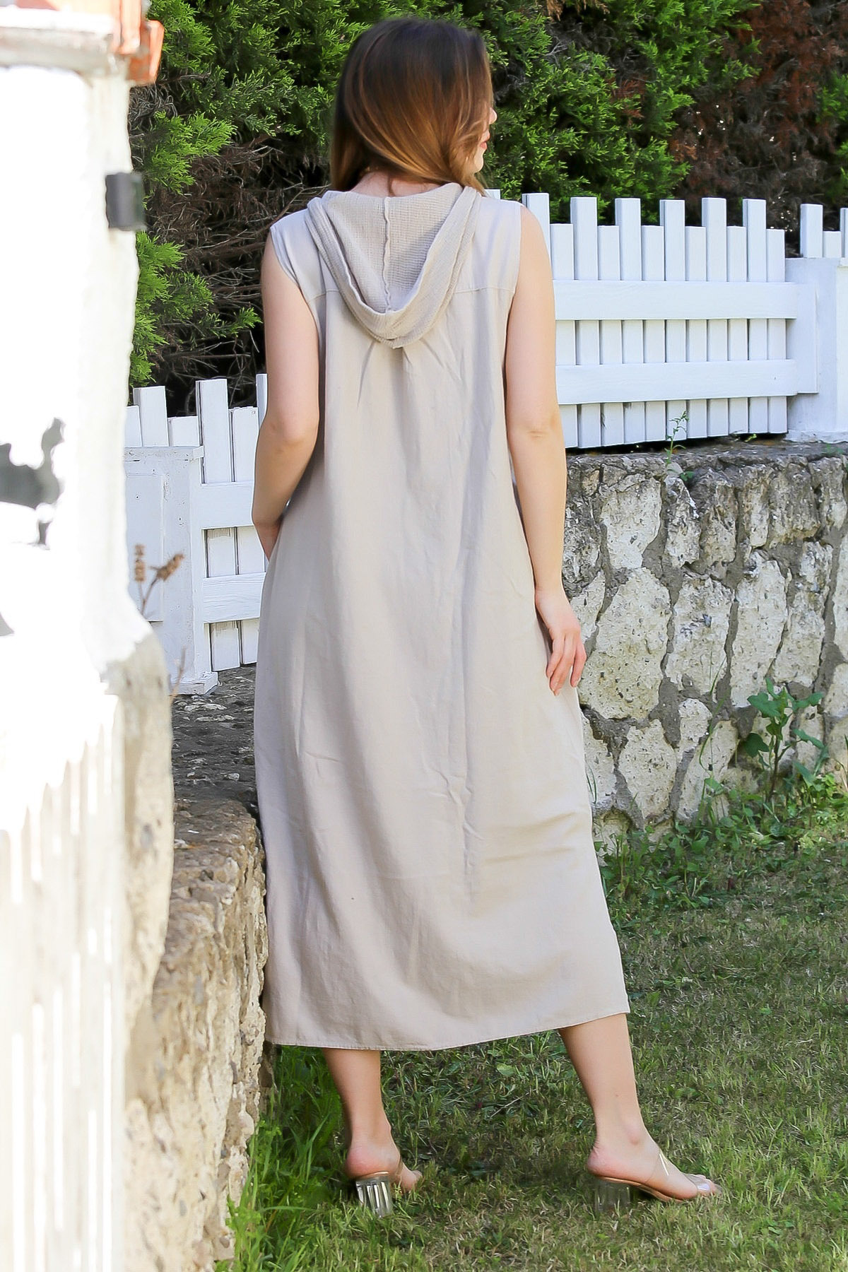 Bej Kapüşonlu Kolsuz Gizli Cepli Yıkamalı Yırtmaçlı Casual Keten Karışımlı Dokuma Elbise 130 66 Bej Kapüşonlu Kolsuz Gizli Cepli Yıkamalı Yırtmaçlı Casual Keten Karışımlı Dokuma Elbise 130 66 M10160000EL90448 XL