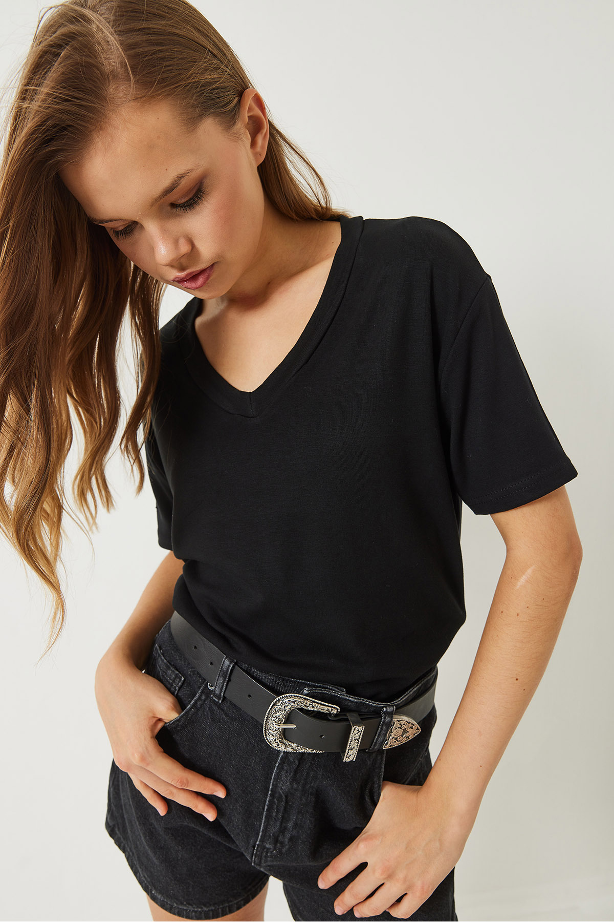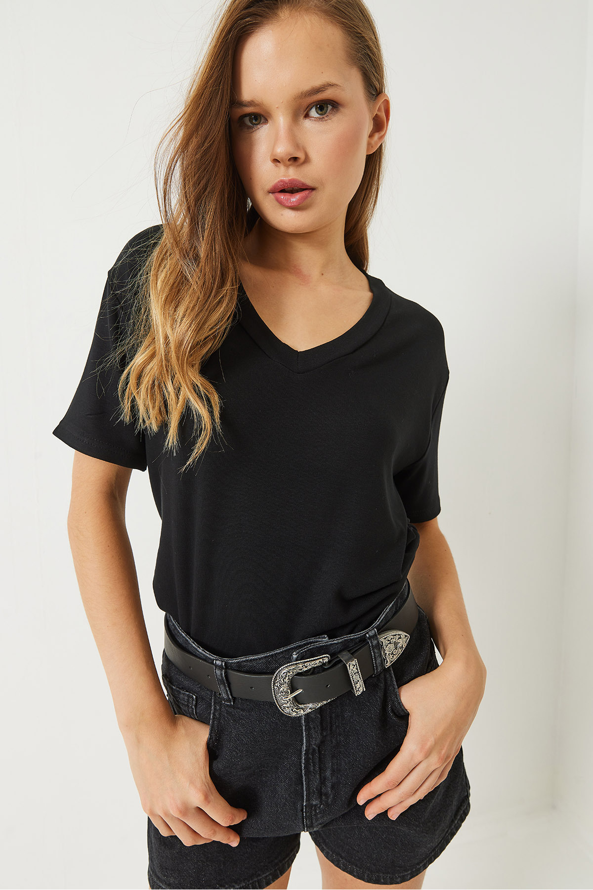 Kadın V Yaka Kısa Kollu Viskon T-Shirt 3077 60283074 Kadın V Yaka Kısa Kollu Viskon T-Shirt 3077 60283074 L