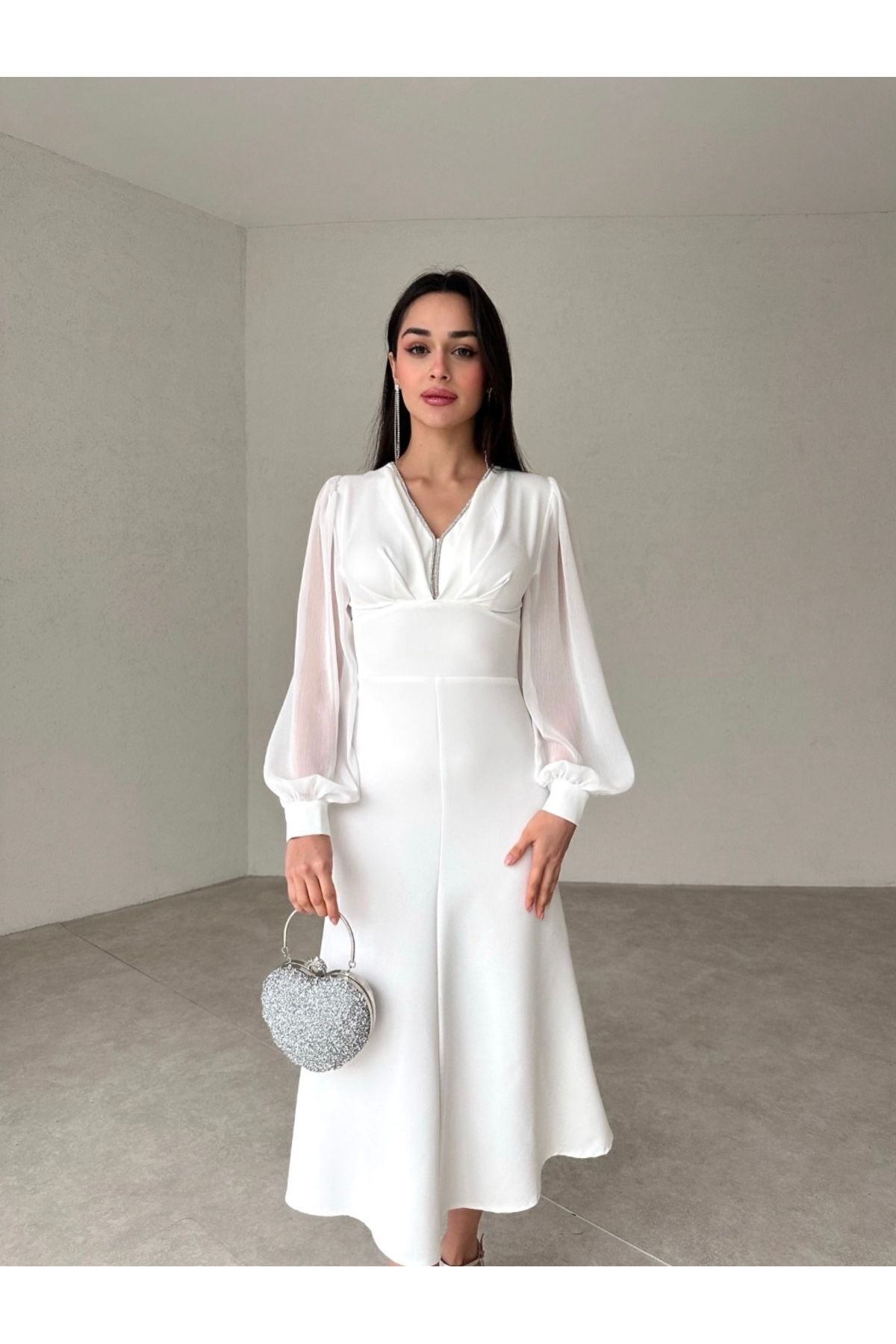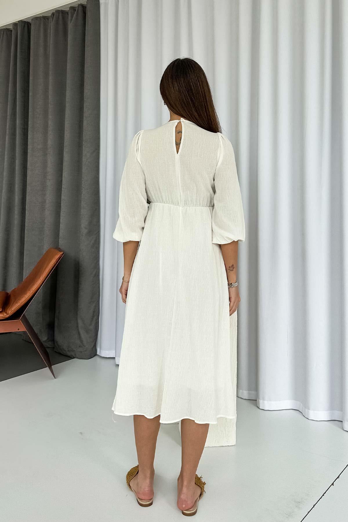 Nakış İşlemeli Müslin Kumaş V Yaka Elbise - Ekru Nakış İşlemeli Müslin Kumaş V Yaka Elbise - Ekru 3M-3506 L