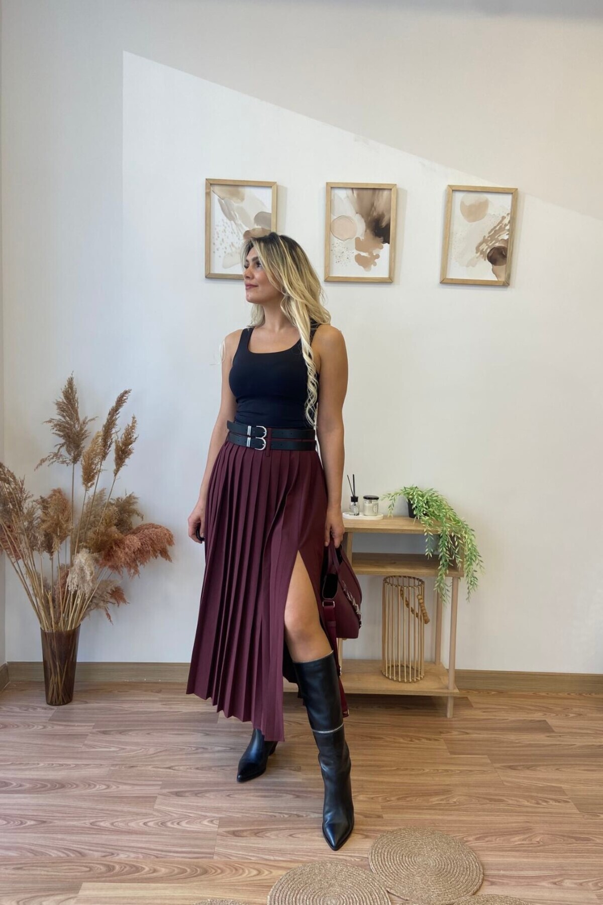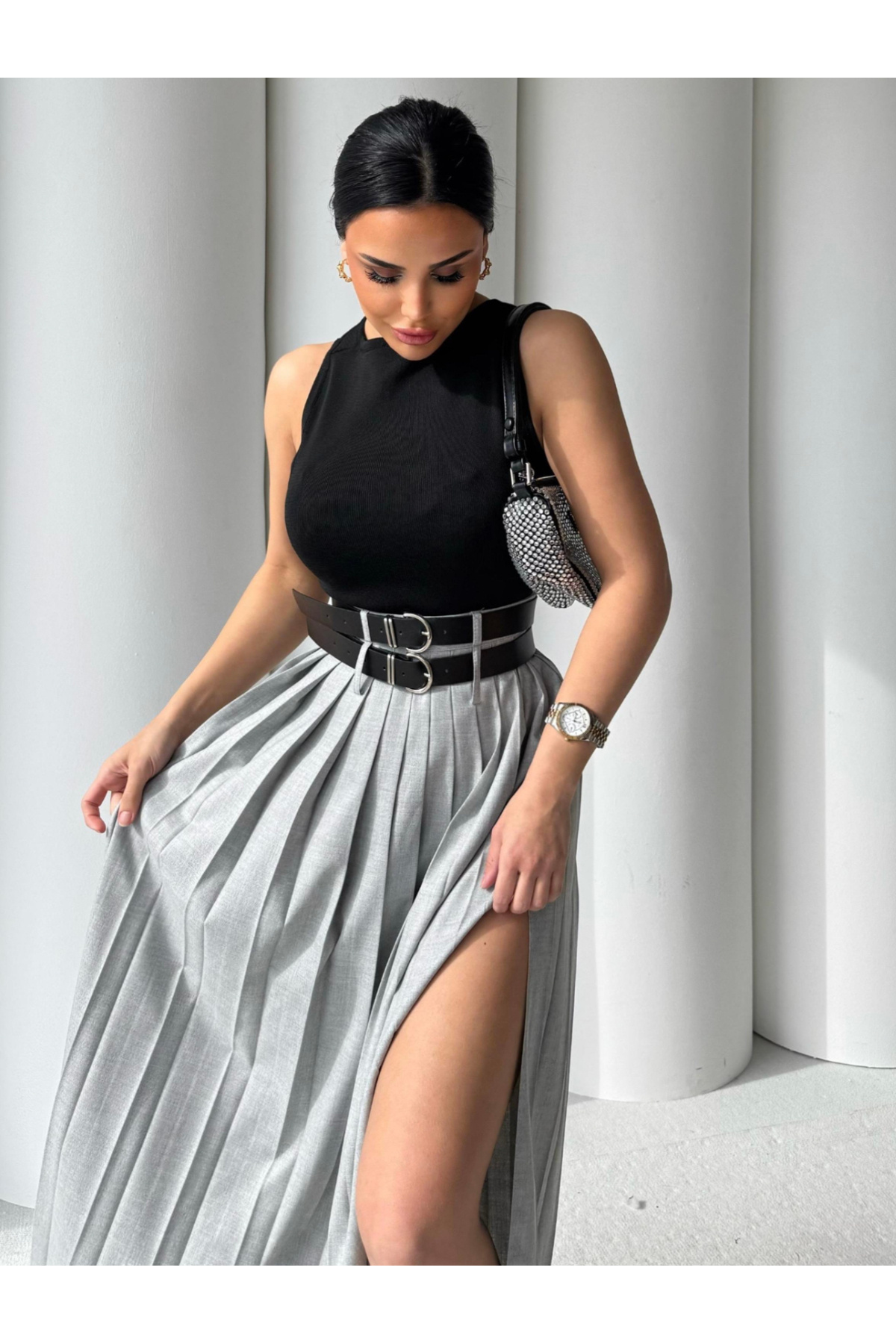 Pamuklu Çift Kemerli Pileli Uzun Yırtmaçlı Etek Pamuklu Çift Kemerli Pileli Uzun Yırtmaçlı Etek L