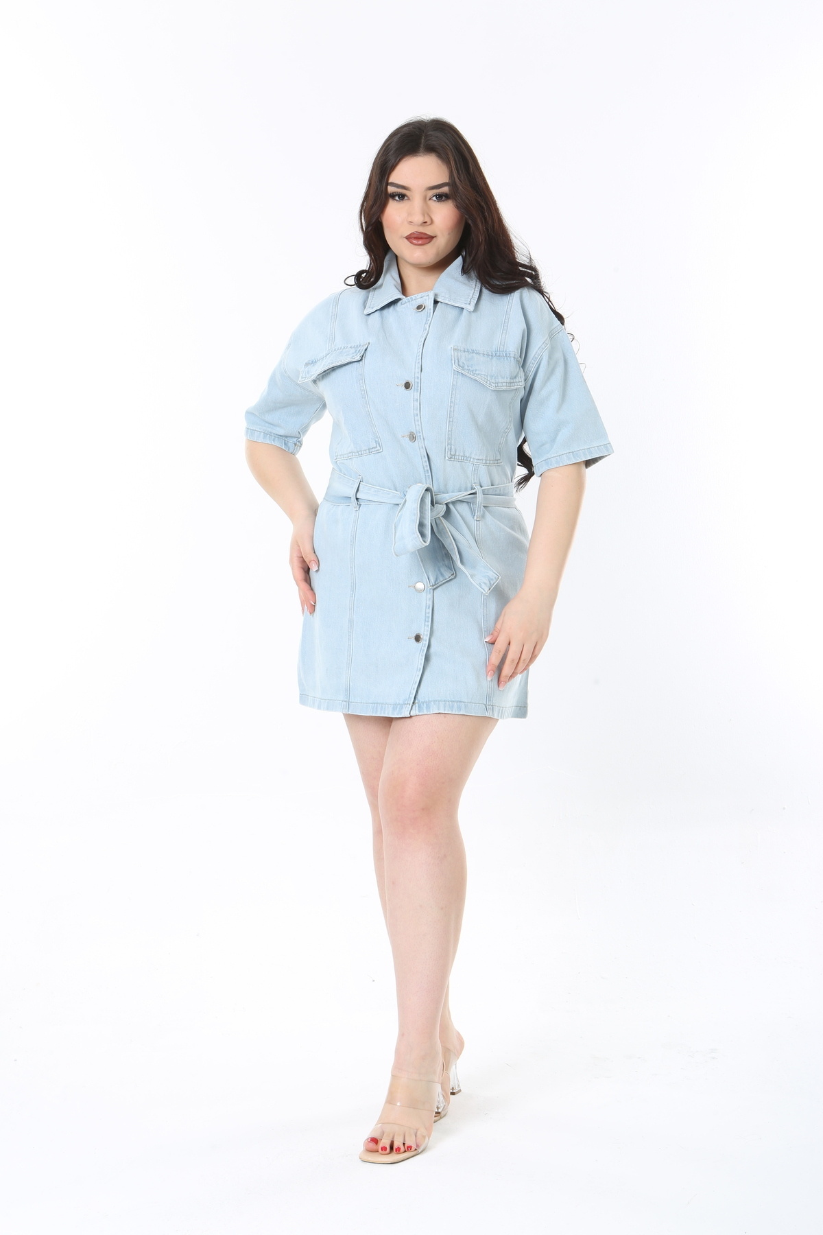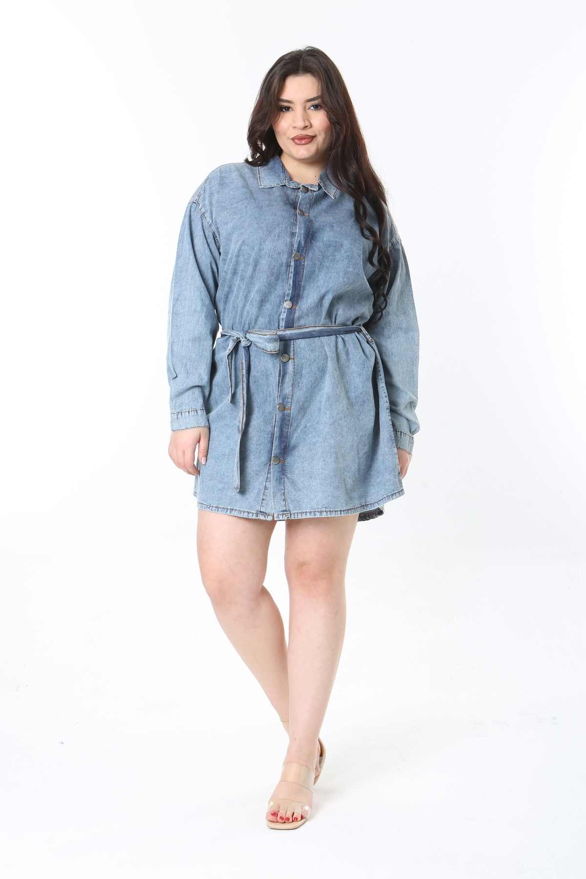 Kadın Büyük Beden Mavi Yıkamalı İnce Kot Kumaş Kuşaklı Kot Tunik Elbise 65N38925 Kadın Büyük Beden Mavi Yıkamalı İnce Kot Kumaş Kuşaklı Kot Tunik Elbise 65N38925 60