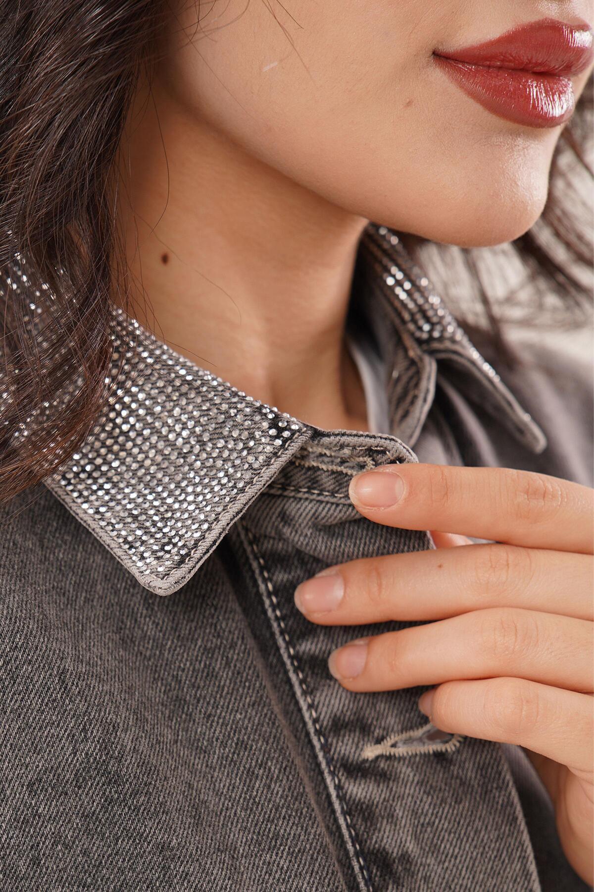 Cepleri ve Yakası Taşlı Antrasit Denim Ceket Cepleri ve Yakası Taşlı Antrasit Denim Ceket 2001-4744 XL