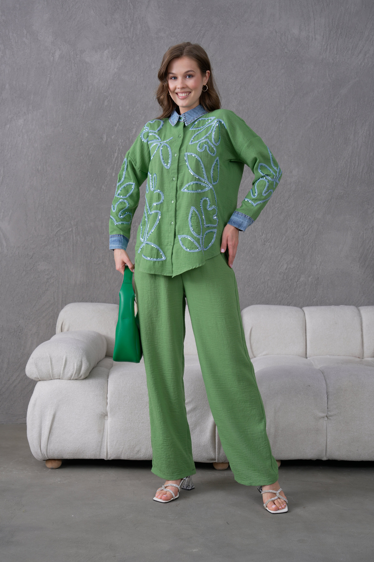 Kadın Önü Nakışlı Yaka Ve Manşeti Kot Detaylı Keten Gömlek Ve Pantolon Alt Üst Takım Kadın Önü Nakışlı Yaka Ve Manşeti Kot Detaylı Keten Gömlek Ve Pantolon Alt Üst Takım 453 XL