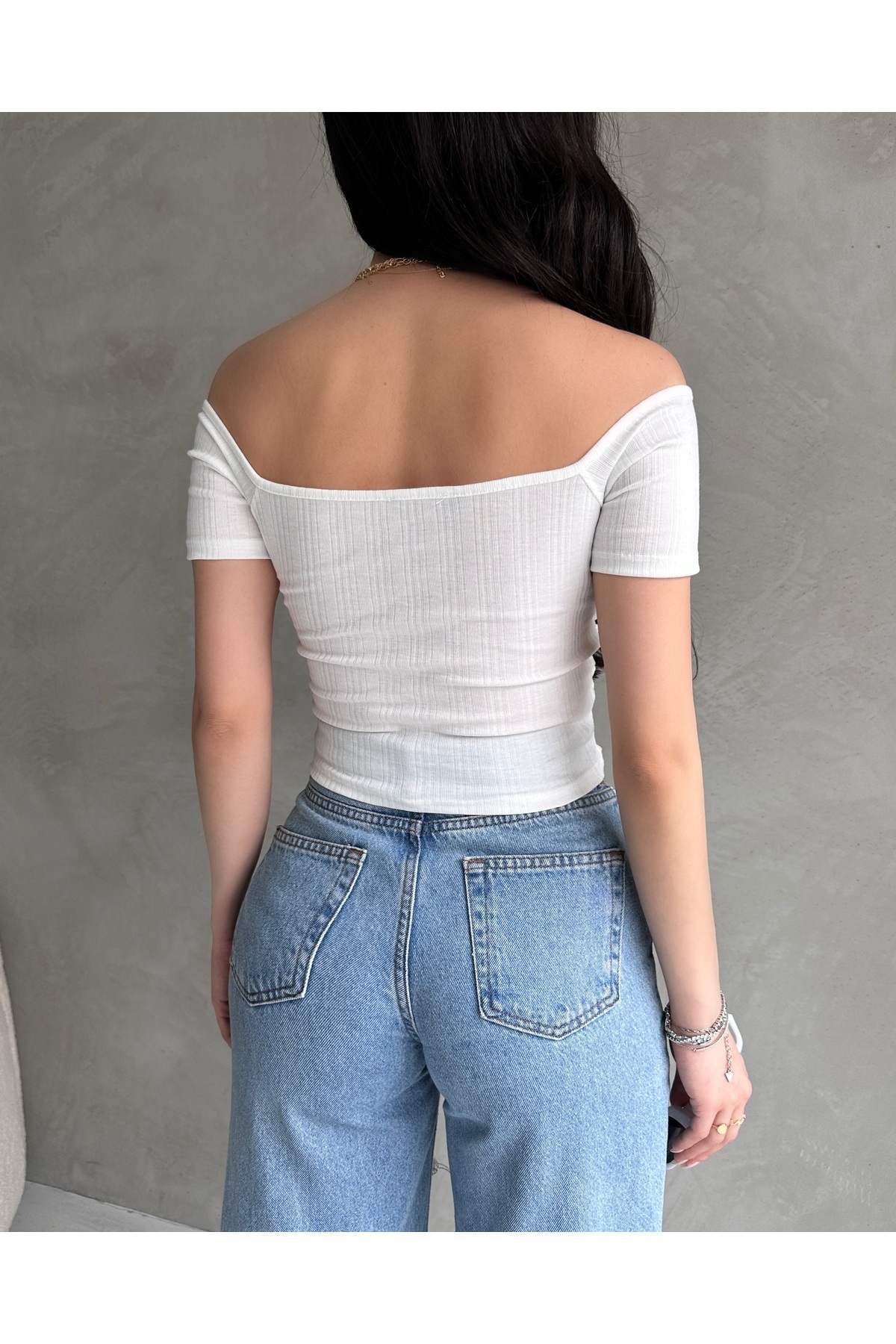 Kadın Kısa Kollu Kayık Yaka Çiçek Detaylı Crop Bluz Beyaz Kadın Kısa Kollu Kayık Yaka Çiçek Detaylı Crop Bluz Beyaz BLZ0245 XL