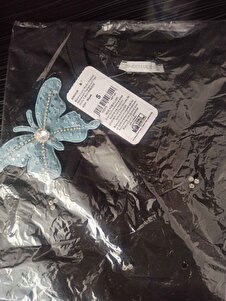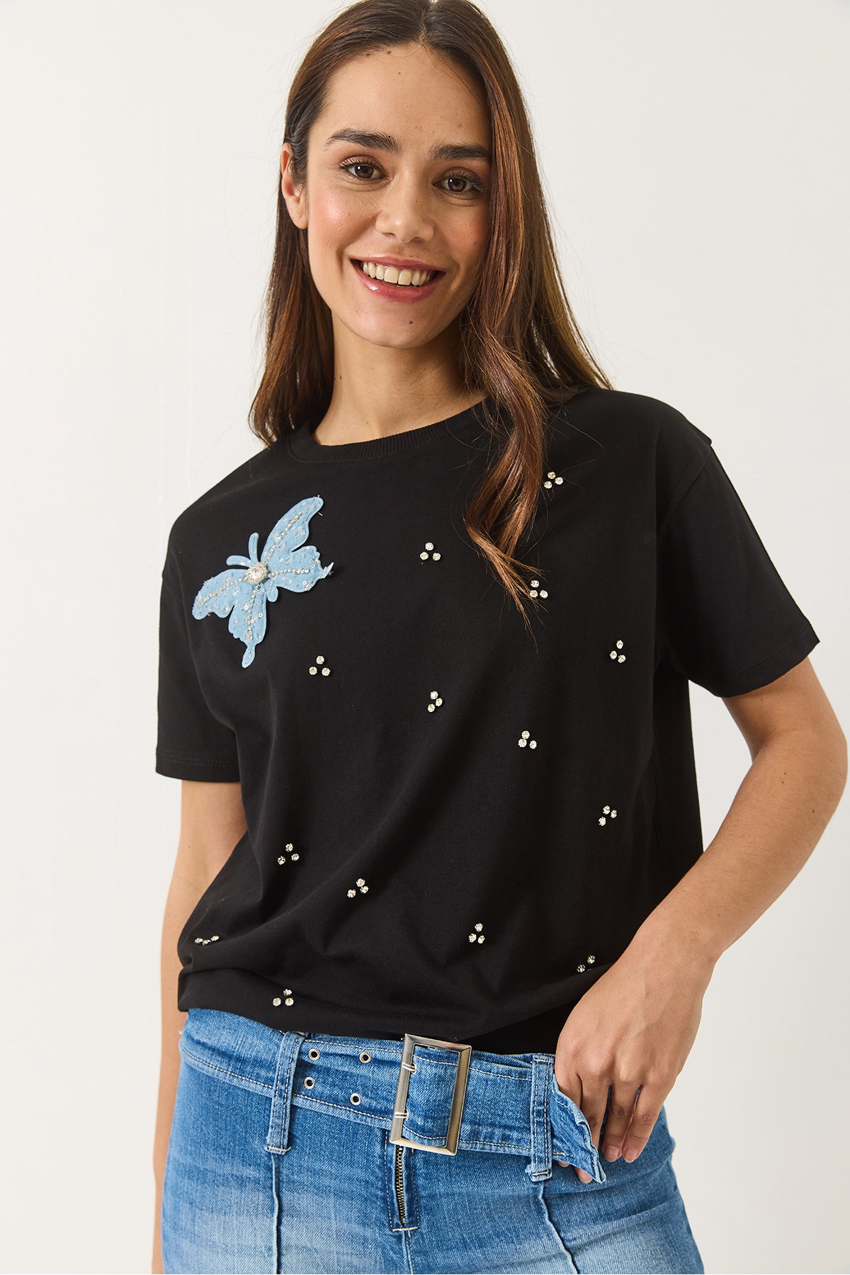 Kadın Kelebek Aksesuarlı Taş İşlemeli Kısa Kollu T-Shirt 60602036 Kadın Kelebek Aksesuarlı Taş İşlemeli Kısa Kollu T-Shirt 60602036 L