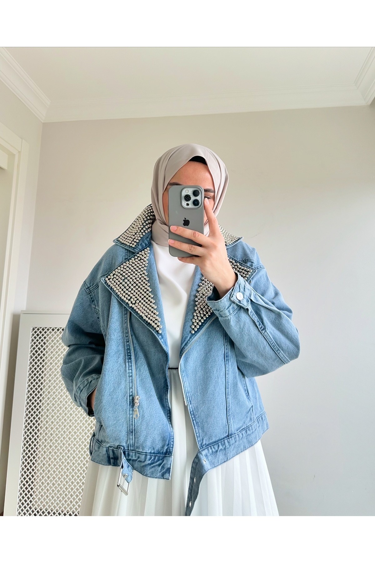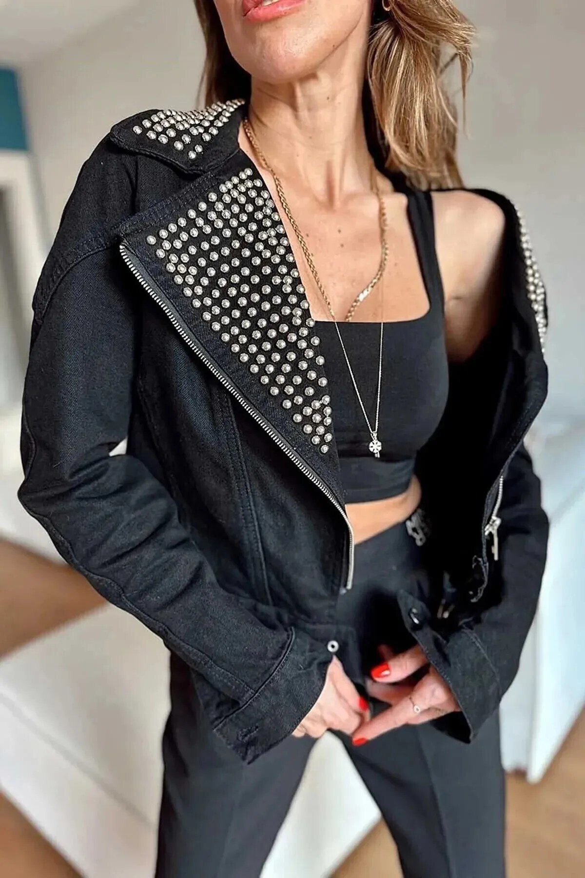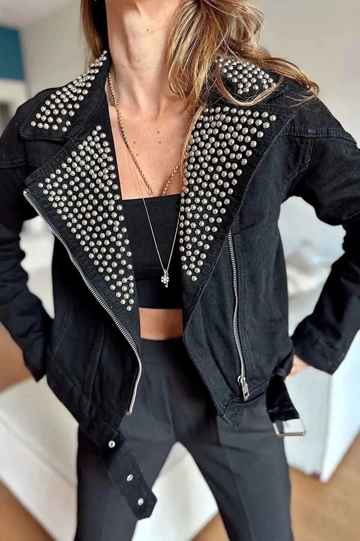 Yakası Taşlı Çapraz Kapama Biker Kot Ceket Yakası Taşlı Çapraz Kapama Biker Kot Ceket taşlıcrop56949 Standart