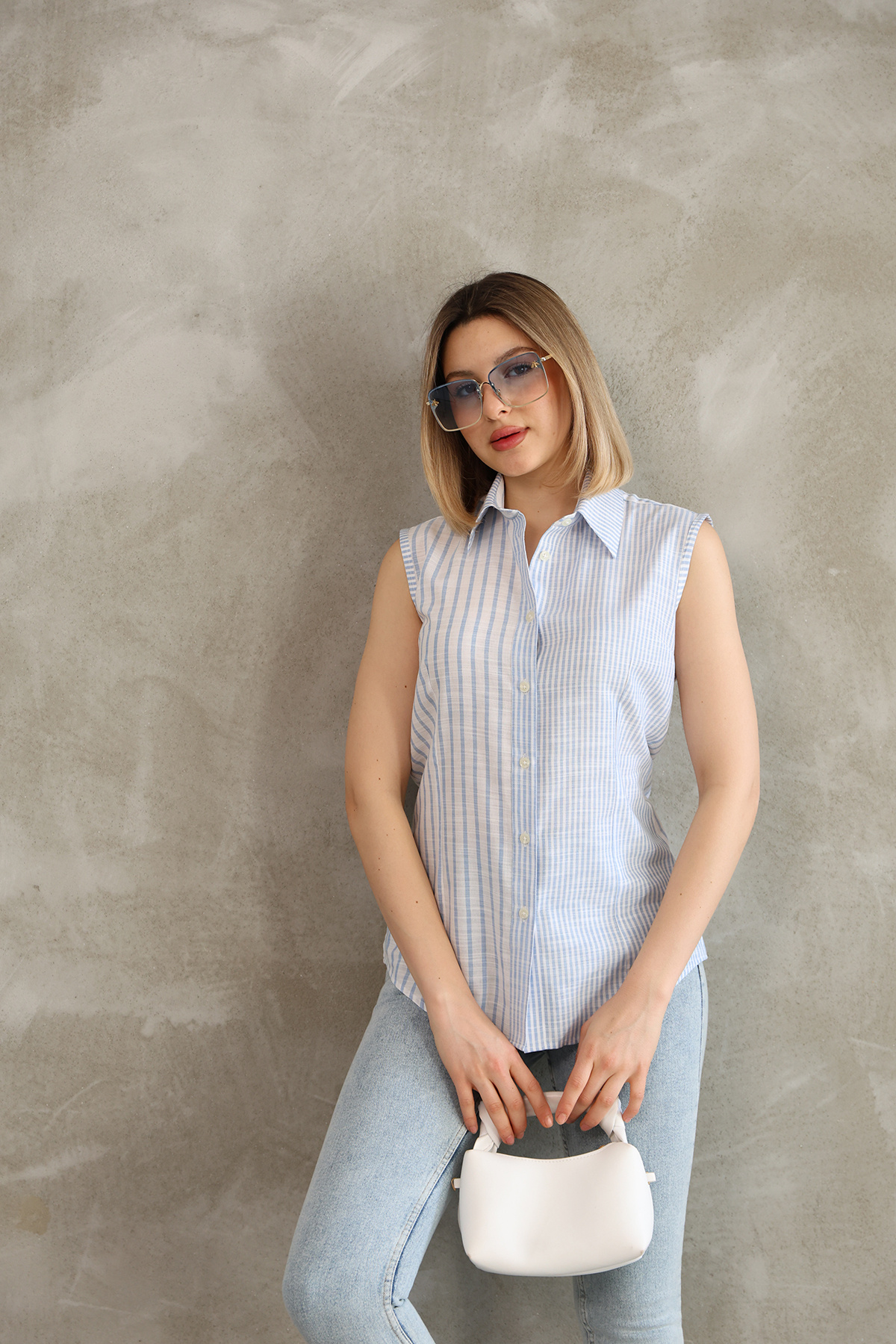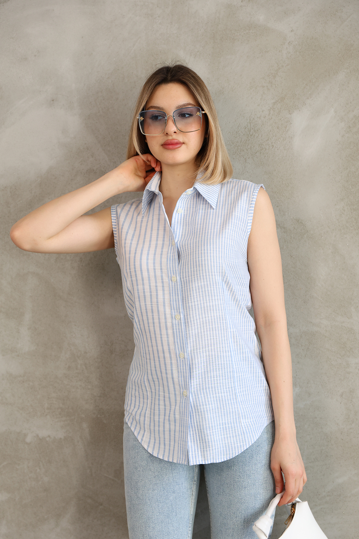 Sıfır Kol Açık Mavi Çizgili Pamuk Keten Kadın Gömlek Sıfır Kol Açık Mavi Çizgili Pamuk Keten Kadın Gömlek 921768914 46