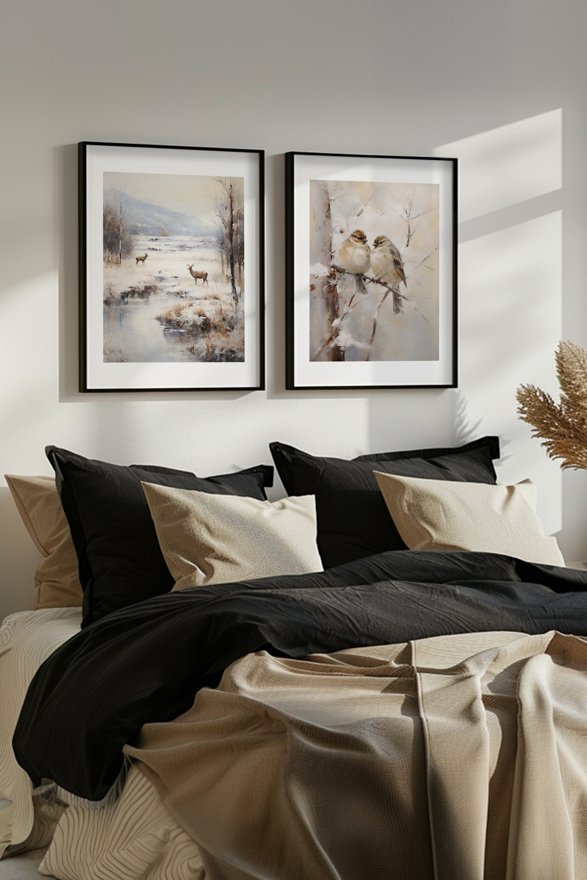 Yağlı boya efektli kuşlu geyikli kış manzaralı siyah ahşap çerçeveli 2'li tablo seti Yuna125 Yağlı boya efektli kuşlu geyikli kış manzaralı siyah ahşap çerçeveli 2'li tablo seti Yuna125 yuna125 50 x 70