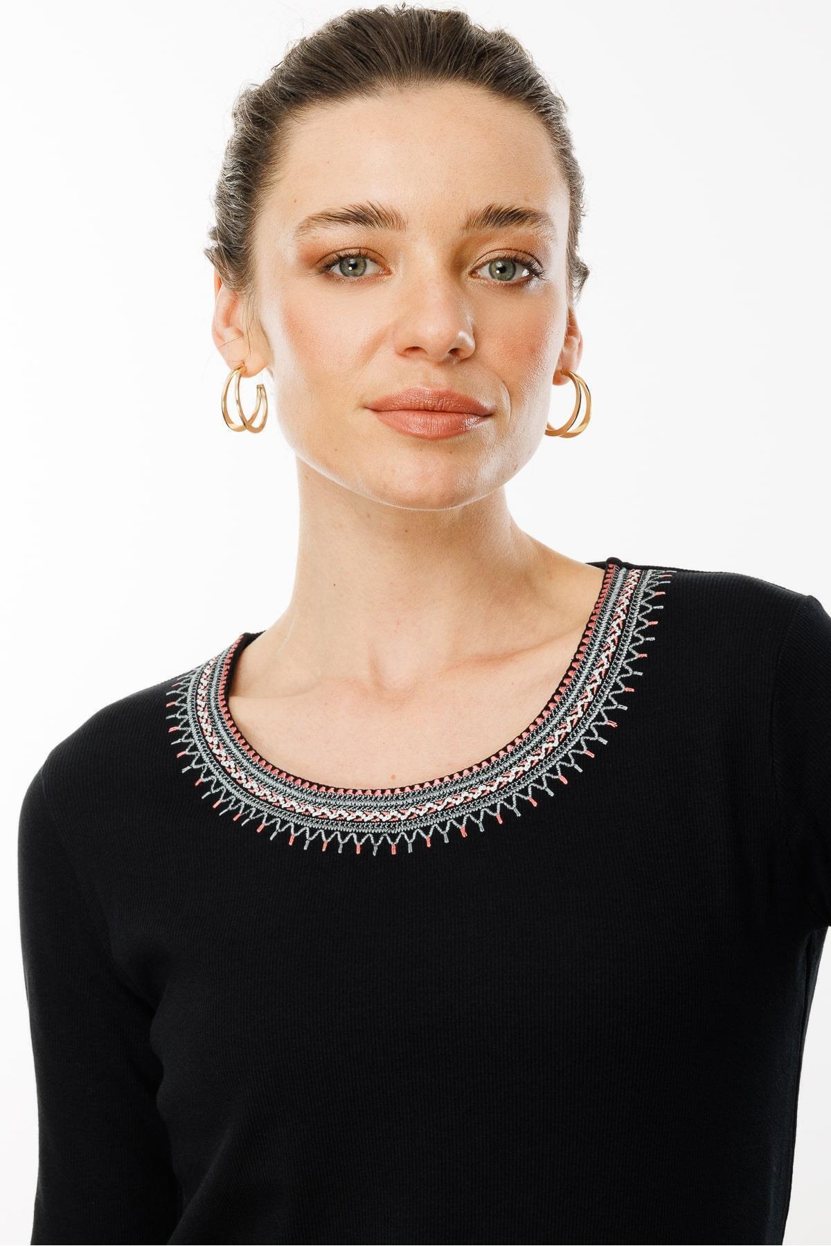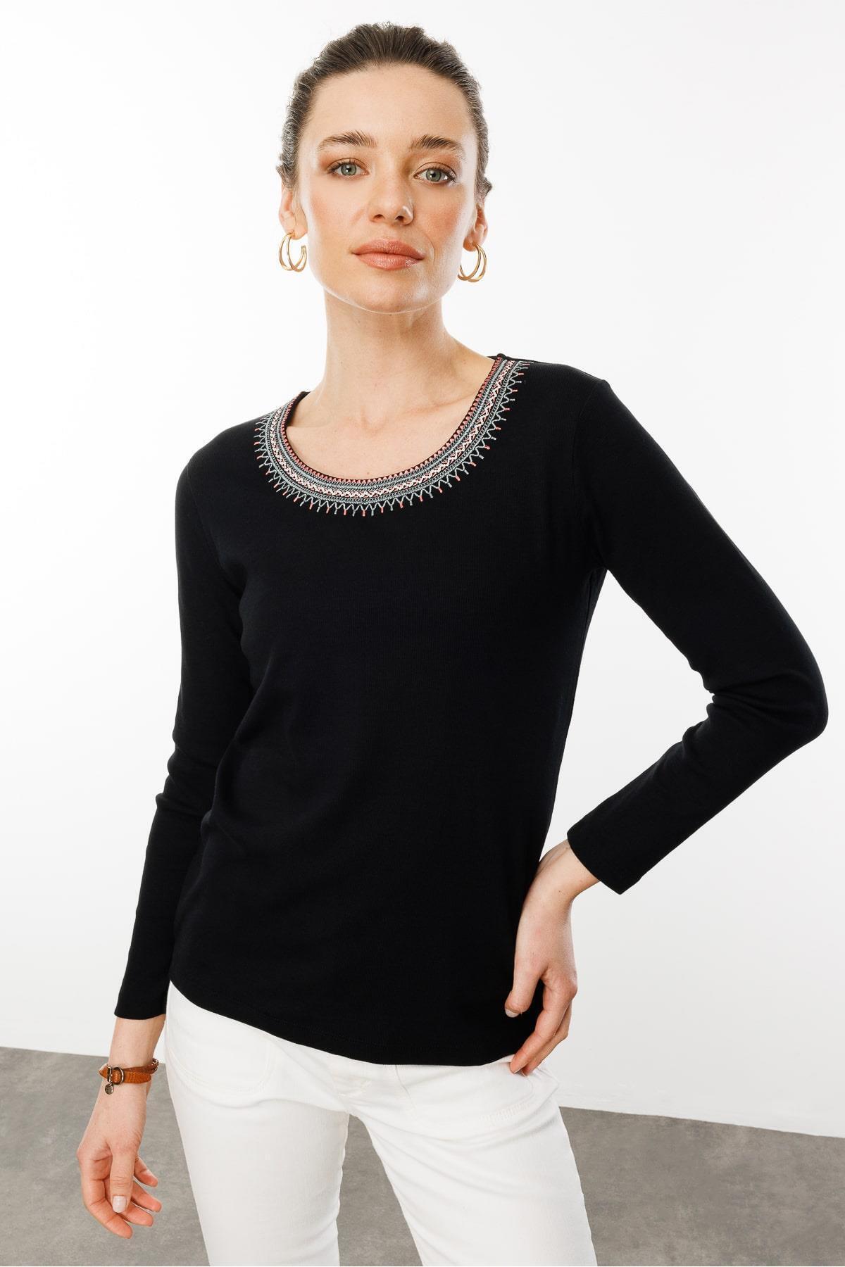 Kadın Sıfır Yaka Yakası Nakış Işlemeli Pamuklu Bluz Siyah Kadın Sıfır Yaka Yakası Nakış Işlemeli Pamuklu Bluz Siyah 8124202525759 XL