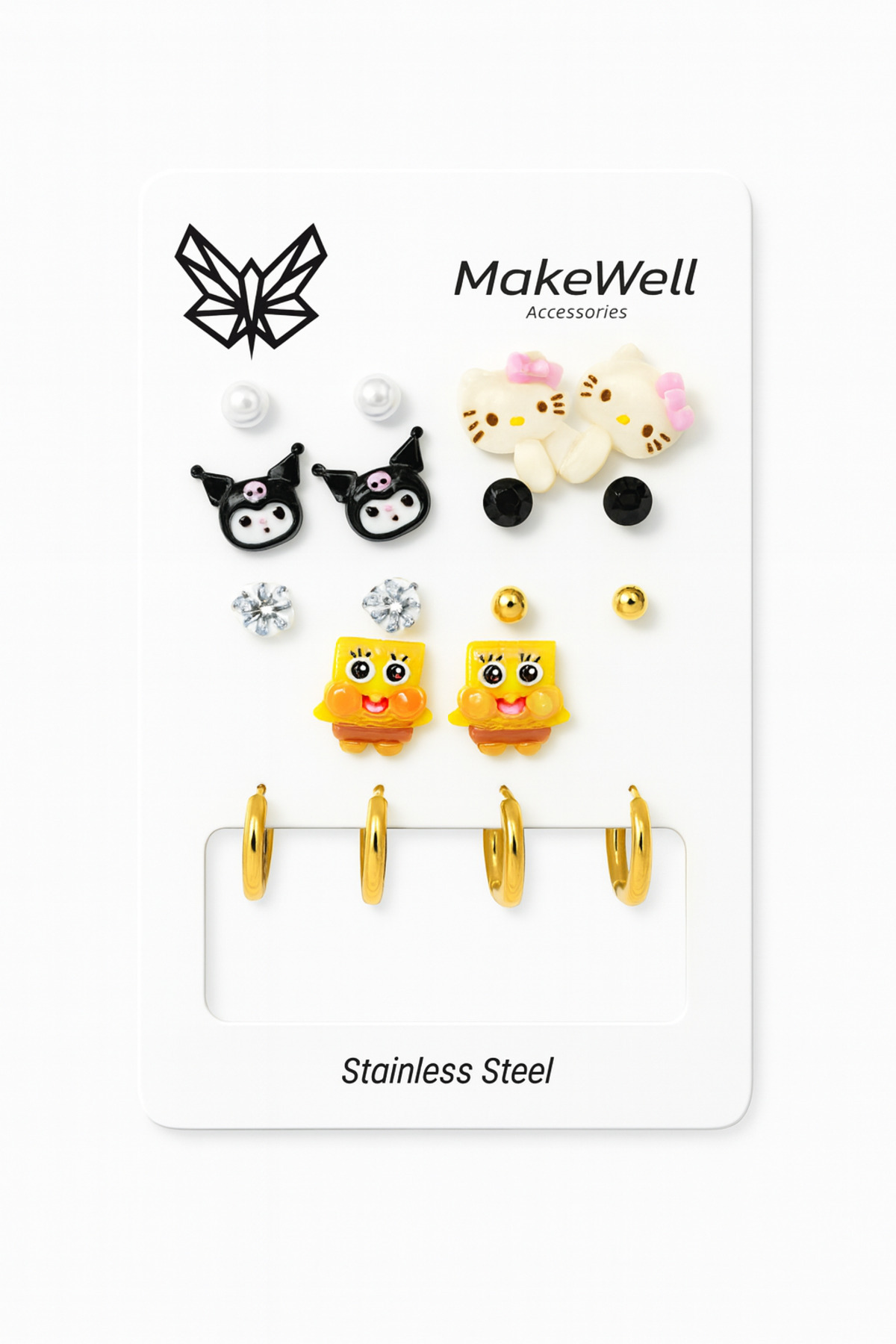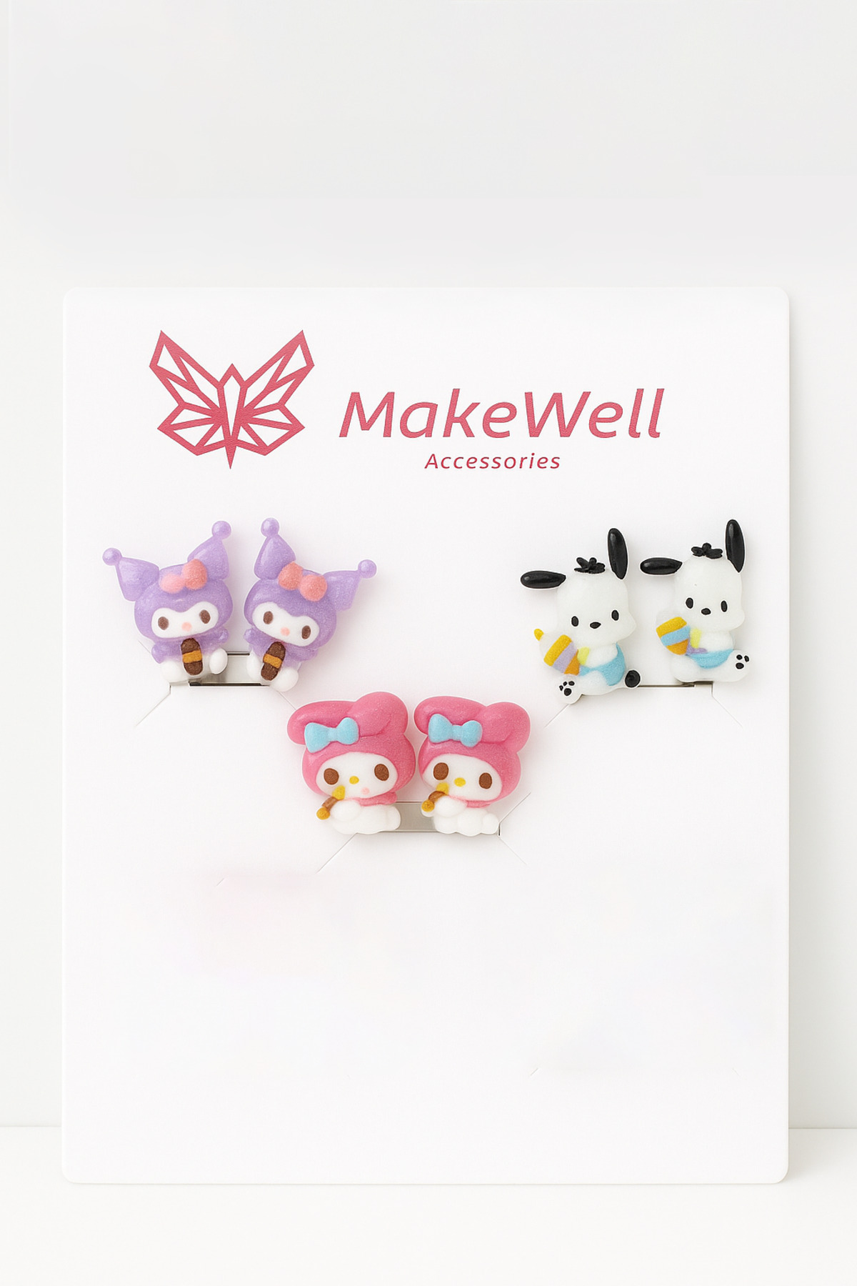 مشخصات فنی Kuromi Cinnammaroll My Melodi Hello Kity Tasarımlı 3lü Küpe Setleri