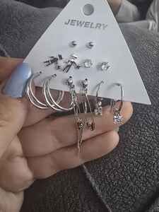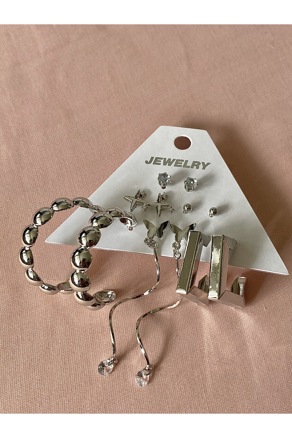 Gümüş Renk Yonca ve Çoklu Halka Görünümlü Çoklu 12'li Kararmaz Pirinç Küpe Gümüş Renk Yonca ve Çoklu Halka Görünümlü Çoklu 12'li Kararmaz Pirinç Küpe KP-600001 تک سایز