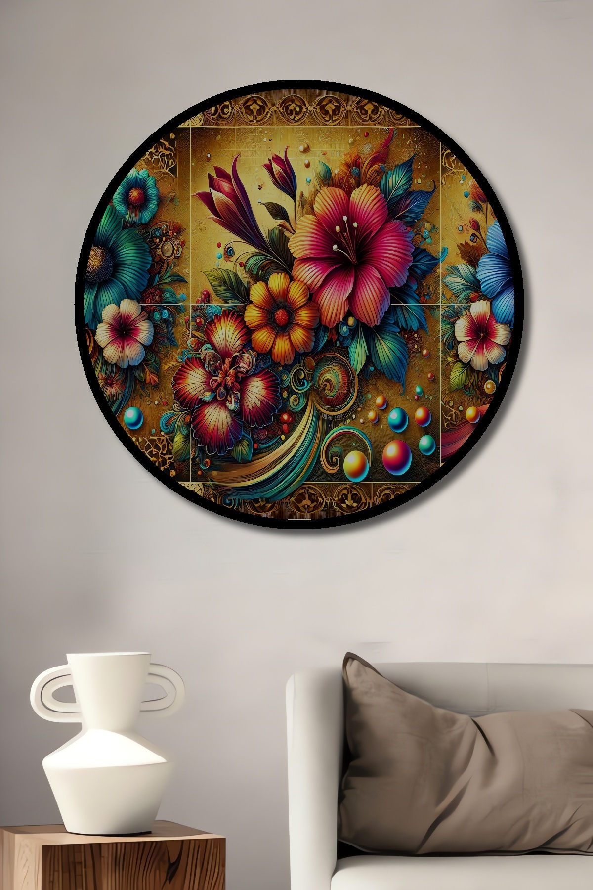 Altın Zemin Üzerinde Çiçek Bahçesi Yağlı Boya Görünümlü Ahşap Dekoratif Yuvarlak Salon/Ofis Tablo Altın Zemin Üzerinde Çiçek Bahçesi Yağlı Boya Görünümlü Ahşap Dekoratif Yuvarlak Salon/Ofis Tablo hkngptbl_7871_T 50 x 50