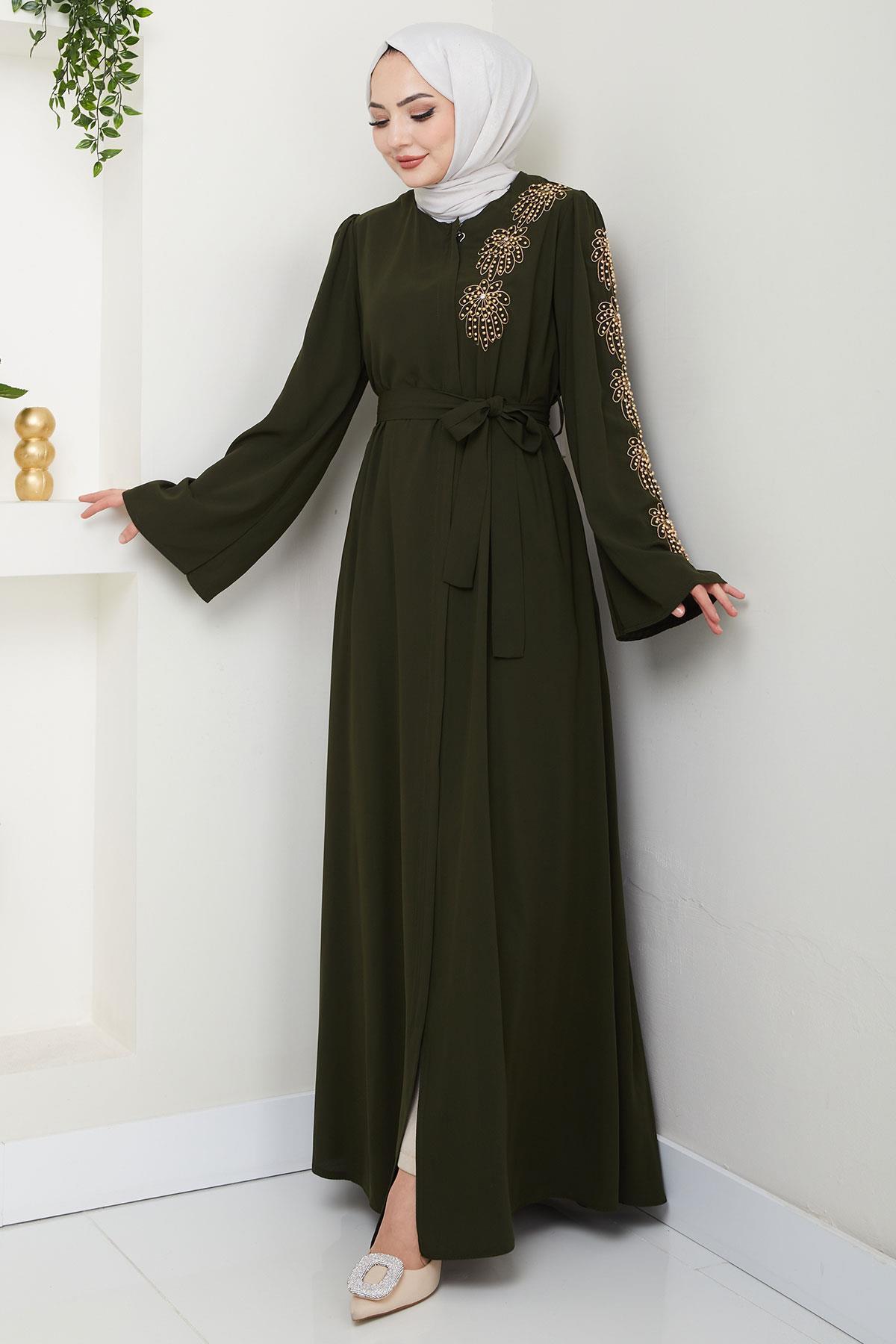 Çiçek Taşlı Kuşaklı Ferace Haki HM2713 Çiçek Taşlı Kuşaklı Ferace Haki HM2713 52
