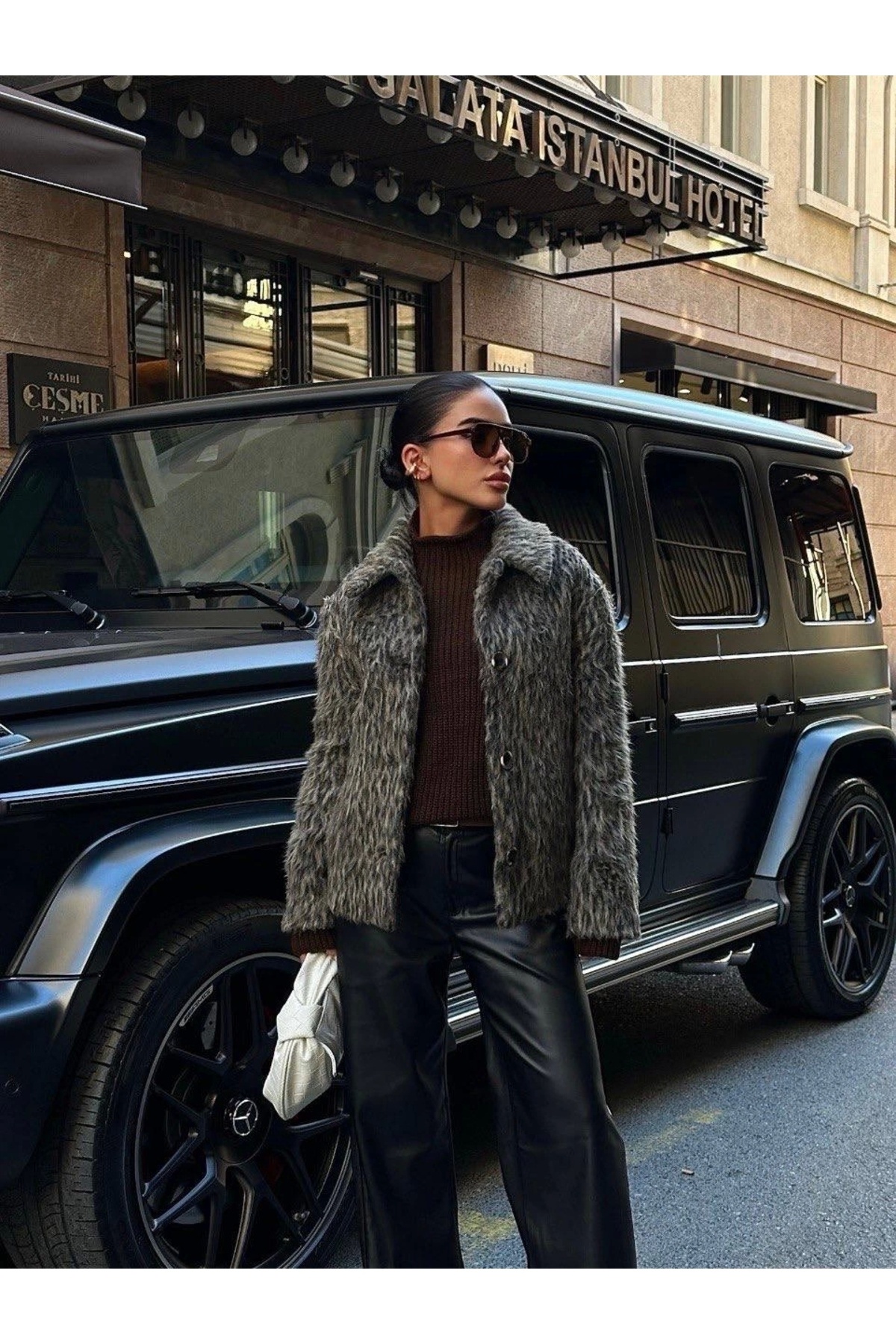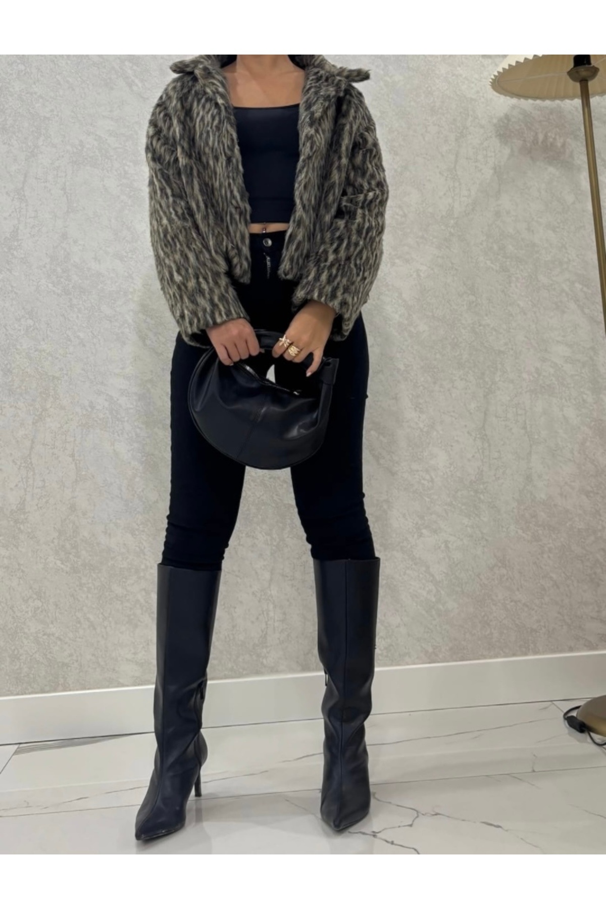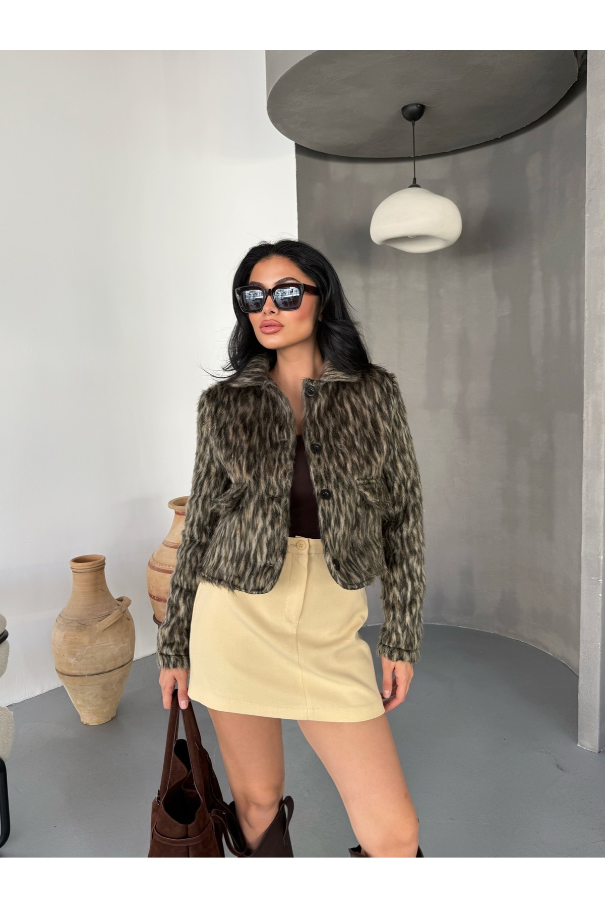 Oversize - Uzun Kollu Kahverengi Leopar Desenli Kürklü Kadın Ceket Oversize - Uzun Kollu Kahverengi Leopar Desenli Kürklü Kadın Ceket P662S3470 XL