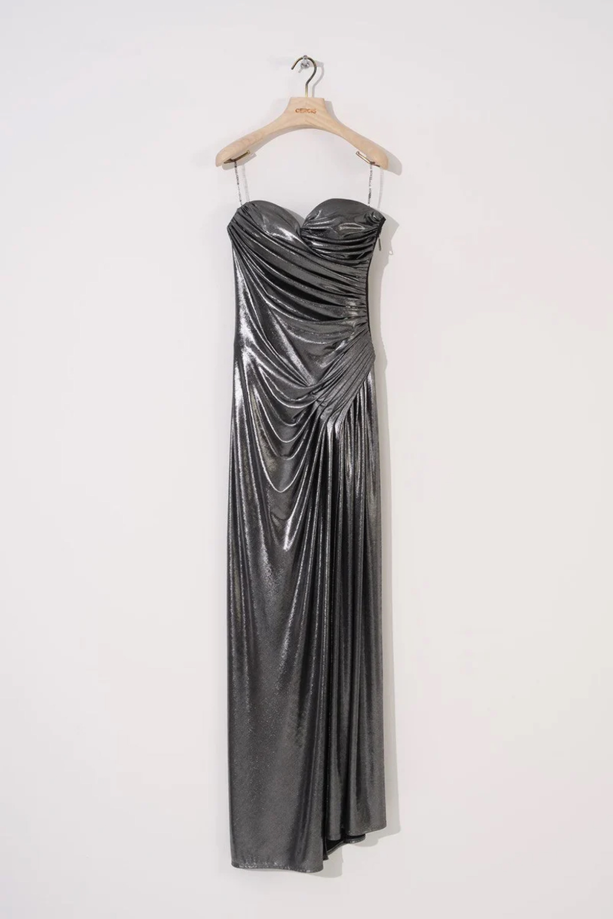 Parlak Straplez Drapeli Yırtmaçlı Uzun Elbise Parlak Straplez Drapeli Yırtmaçlı Uzun Elbise M23YCR001083 42