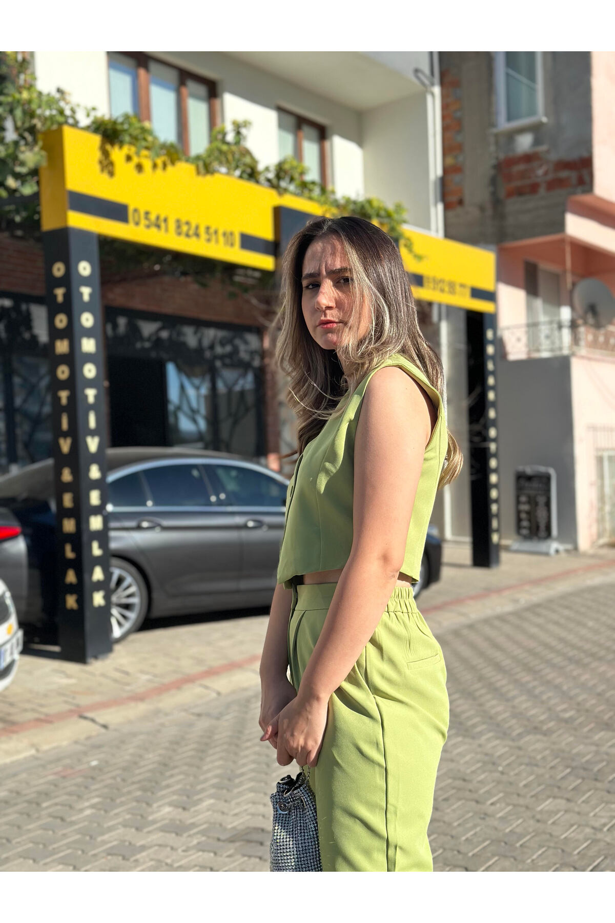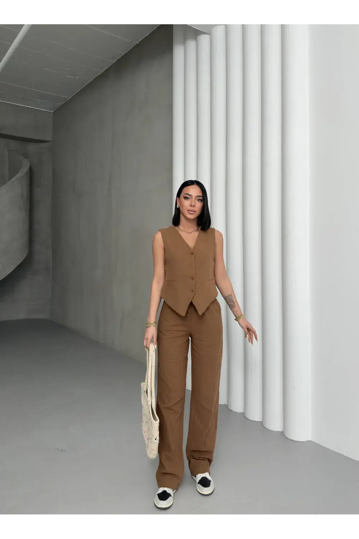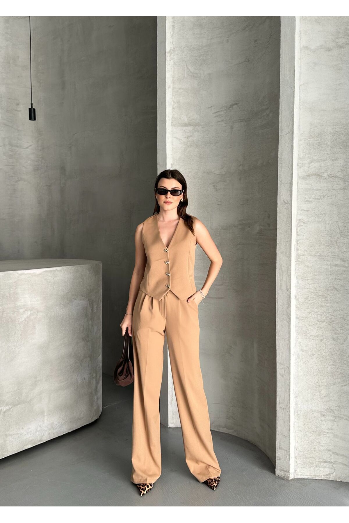 Double Kumaş Fiyonk Düğmeli Astarlı Yelekli Ön Pileli Cepli Yarım Lastik Bel Geniş Pantolonlu Takım Double Kumaş Fiyonk Düğmeli Astarlı Yelekli Ön Pileli Cepli Yarım Lastik Bel Geniş Pantolonlu Takım aytenli01016 L