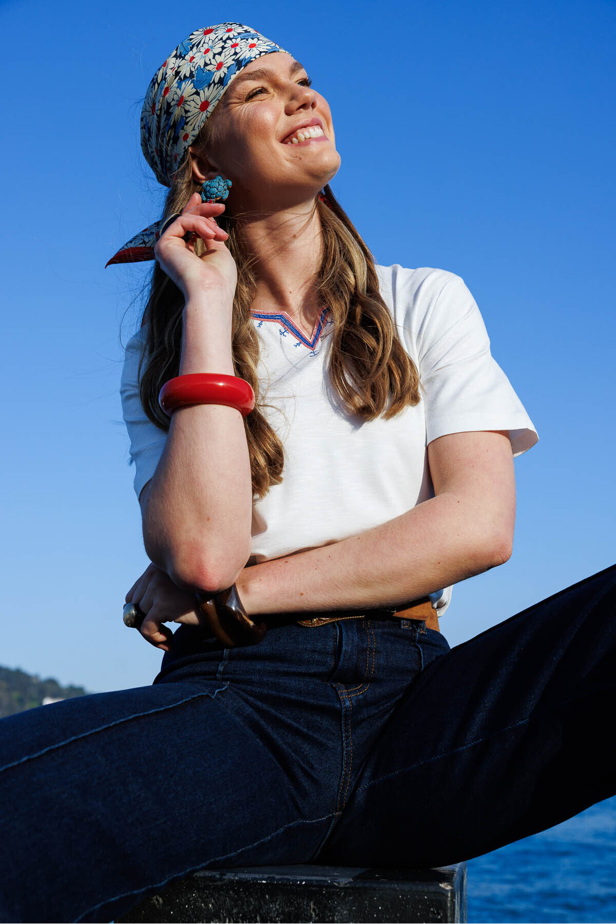 Kadın Yakası Yırtmaçlı ve İşlemeli T-shirt İndigo Kadın Yakası Yırtmaçlı ve İşlemeli T-shirt İndigo 25768 XL