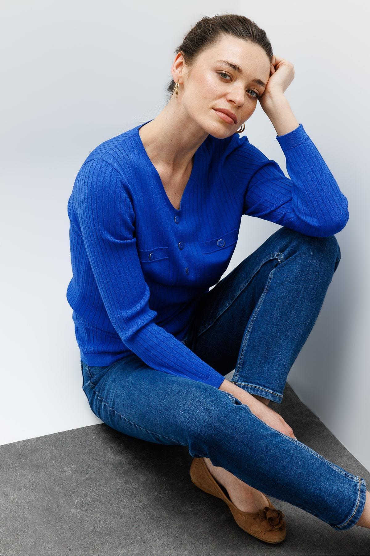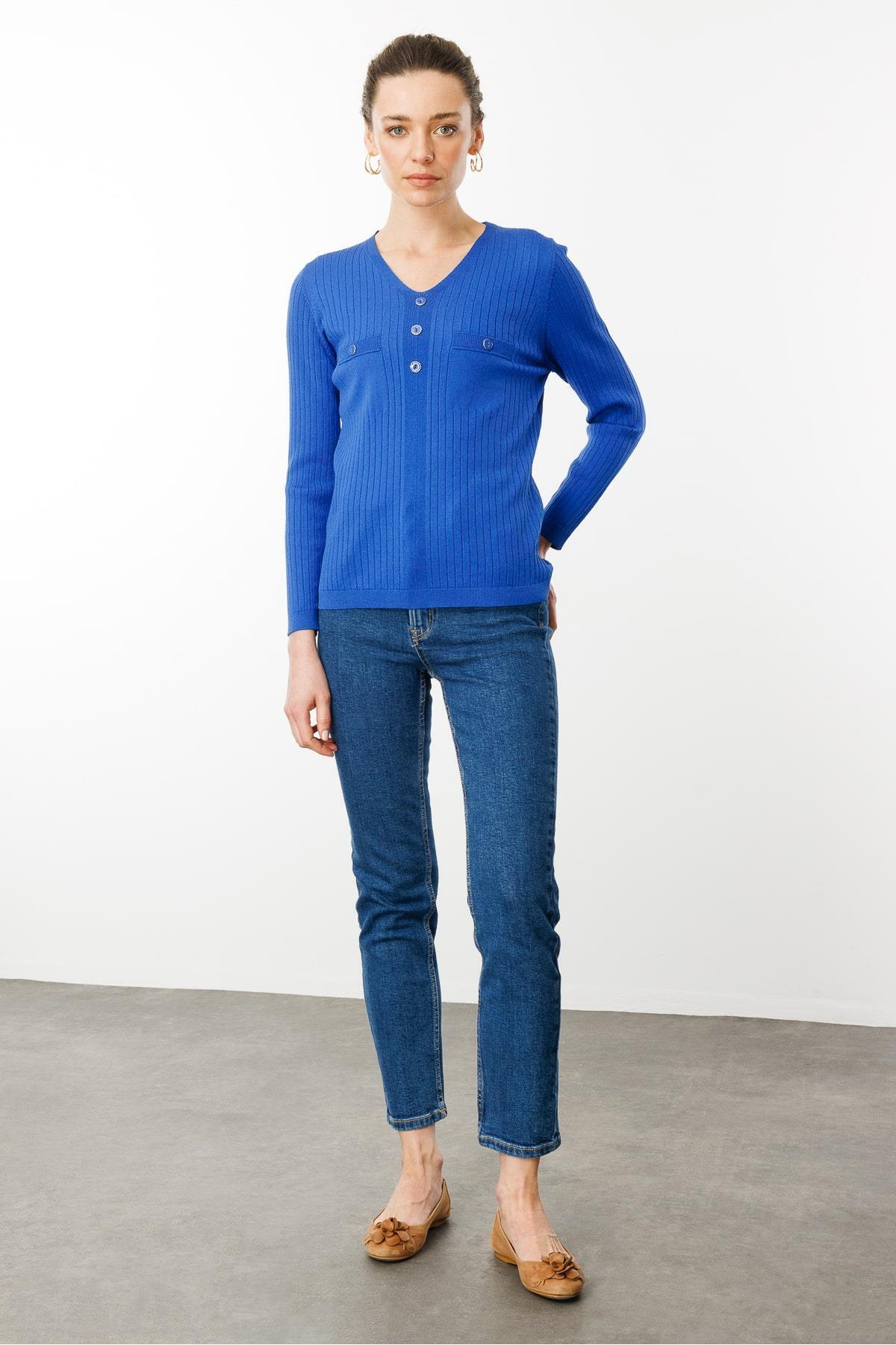 Kadın V Yaka Fitilli Triko Bluz Saks Kadın V Yaka Fitilli Triko Bluz Saks 25353 XL