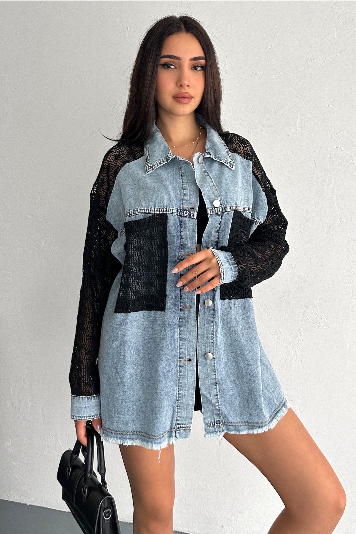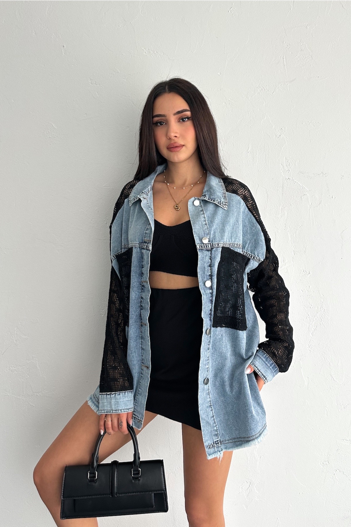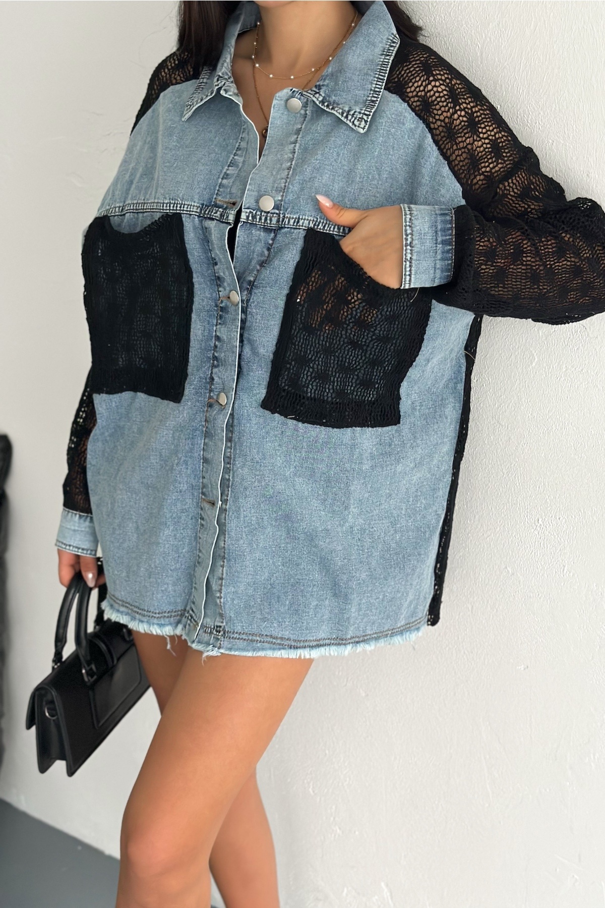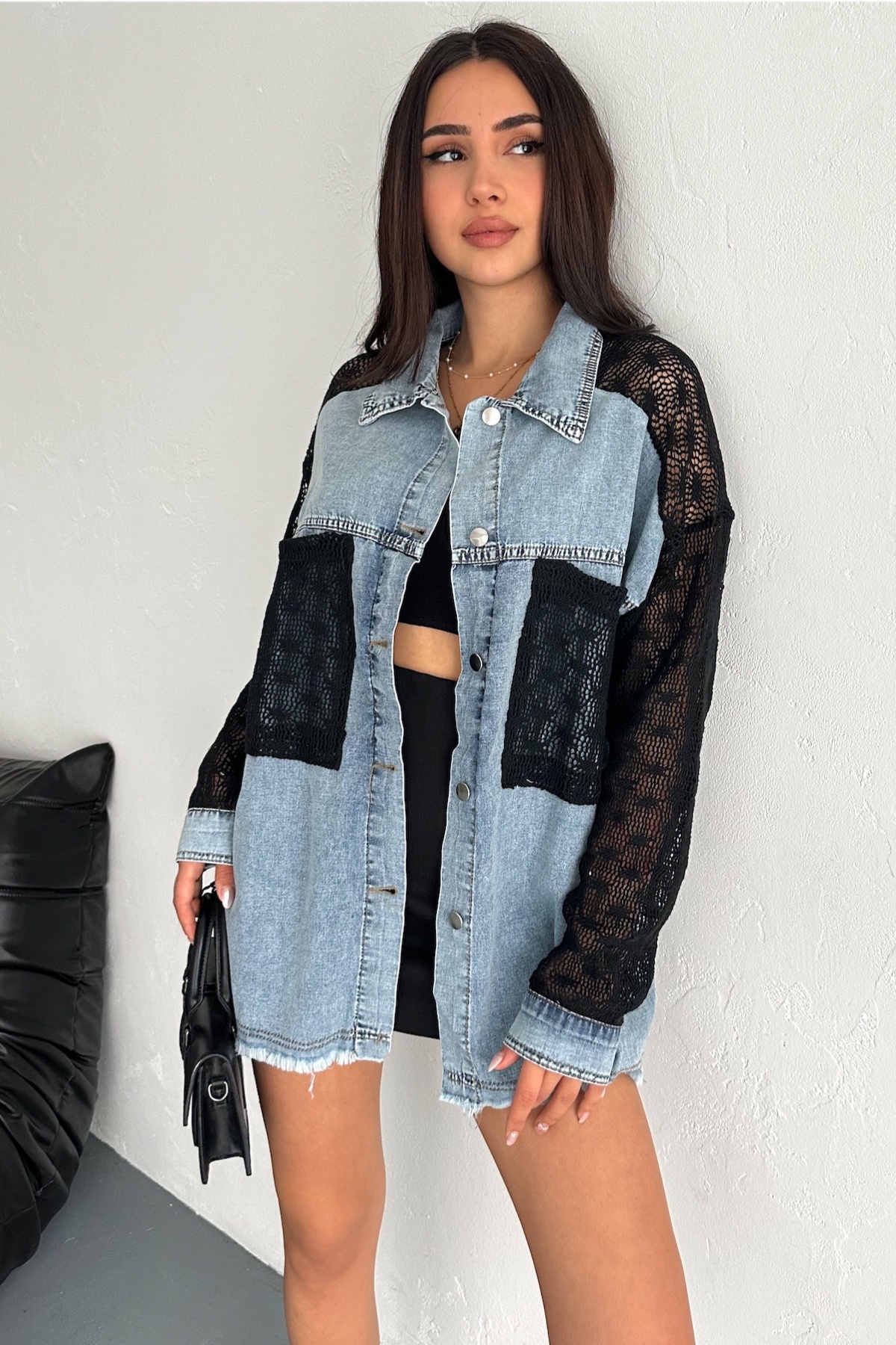Kadın Siyah Standart Cep Ve Sırtı Komple Dantel Detaylı Çift Cepli Denim Kot Garnili Oversize Hırka Kadın Siyah Standart Cep Ve Sırtı Komple Dantel Detaylı Çift Cepli Denim Kot Garnili Oversize Hırka 6118 تک سایز