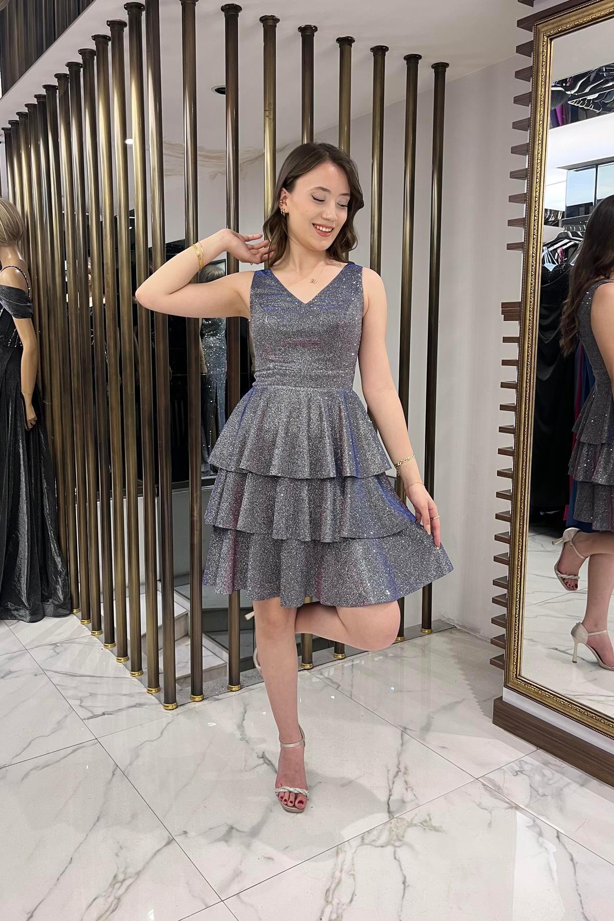 Kadın İp Askılı Simli Kat Kat Kısa Elbise Kadın İp Askılı Simli Kat Kat Kısa Elbise S-25Y0230001 L