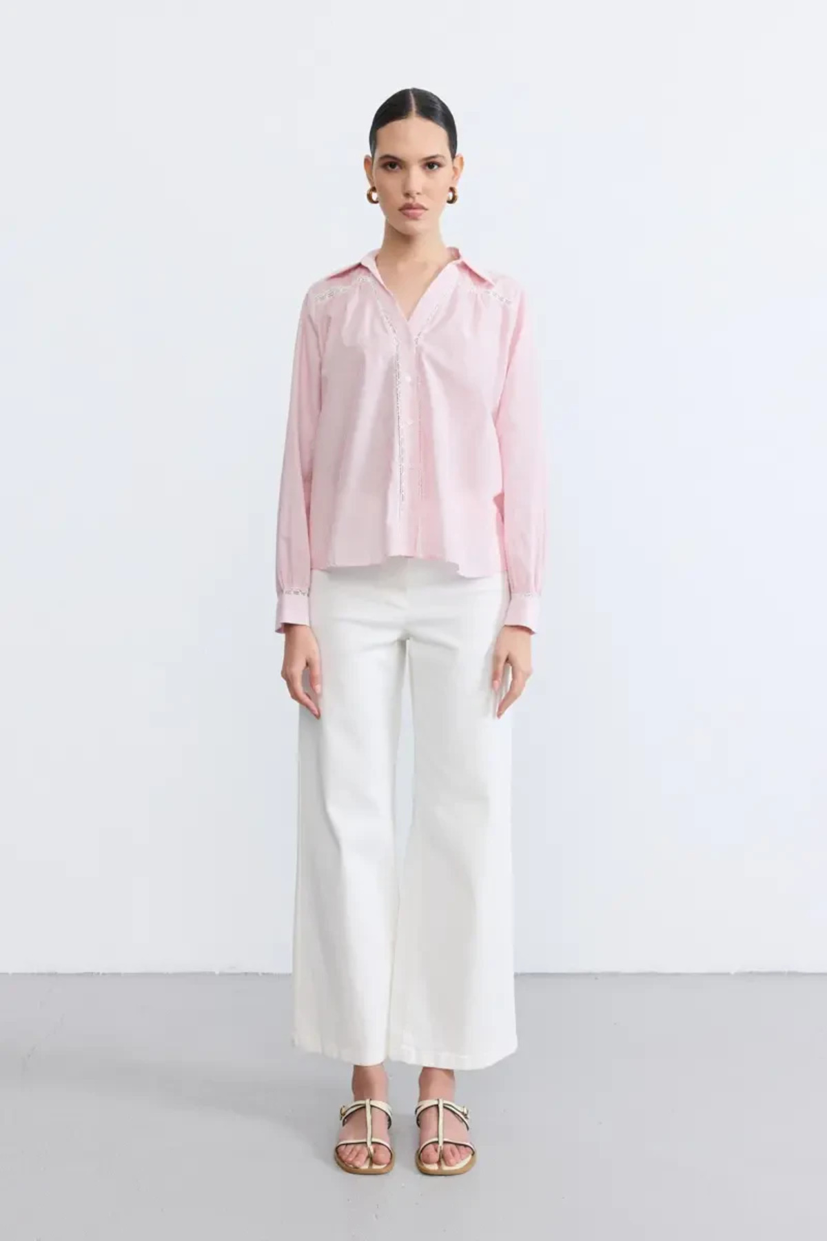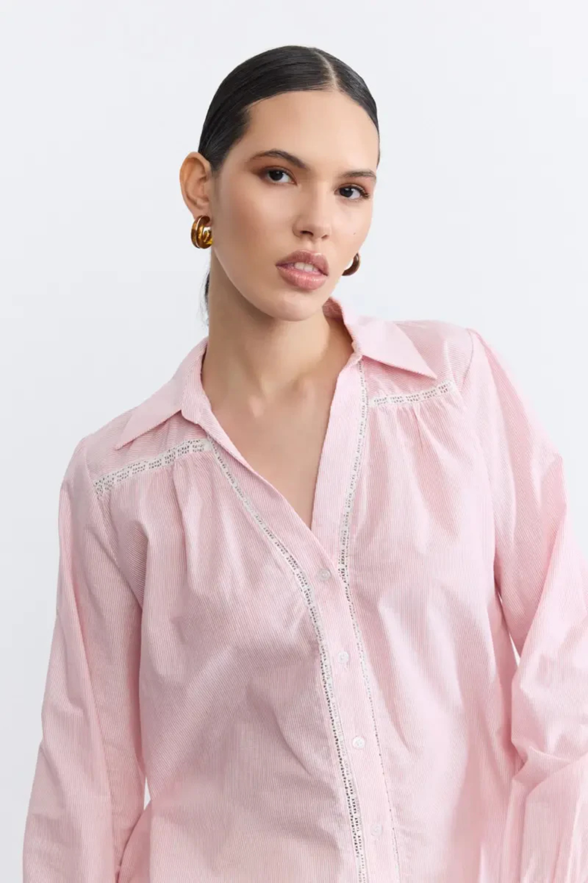 Çizgili Dantel Detaylı Koton Gömlek - Kırmızı Çizgili Dantel Detaylı Koton Gömlek - Kırmızı 25YG002529 XL