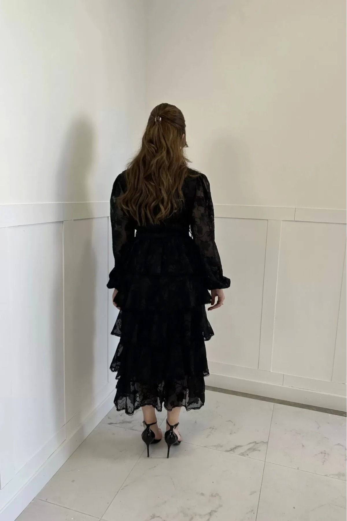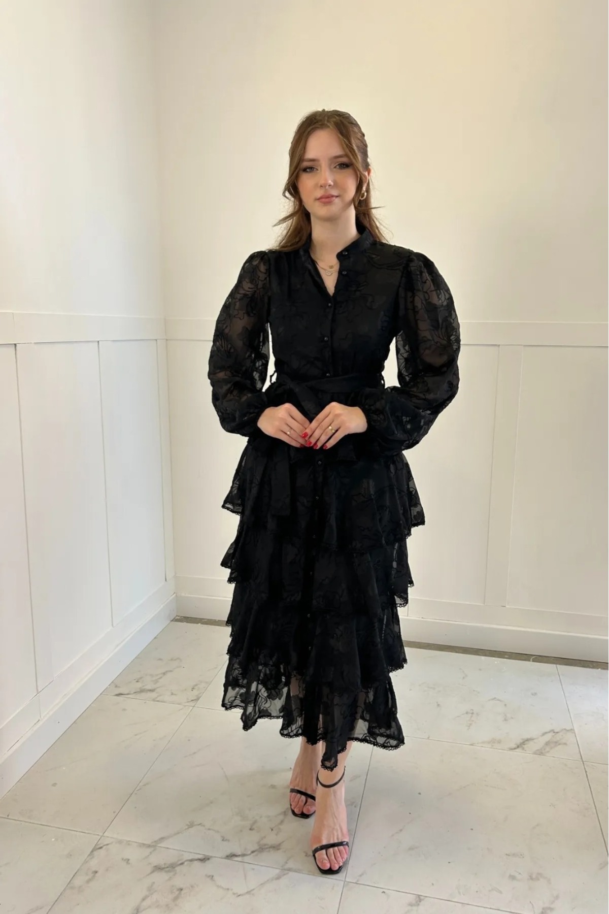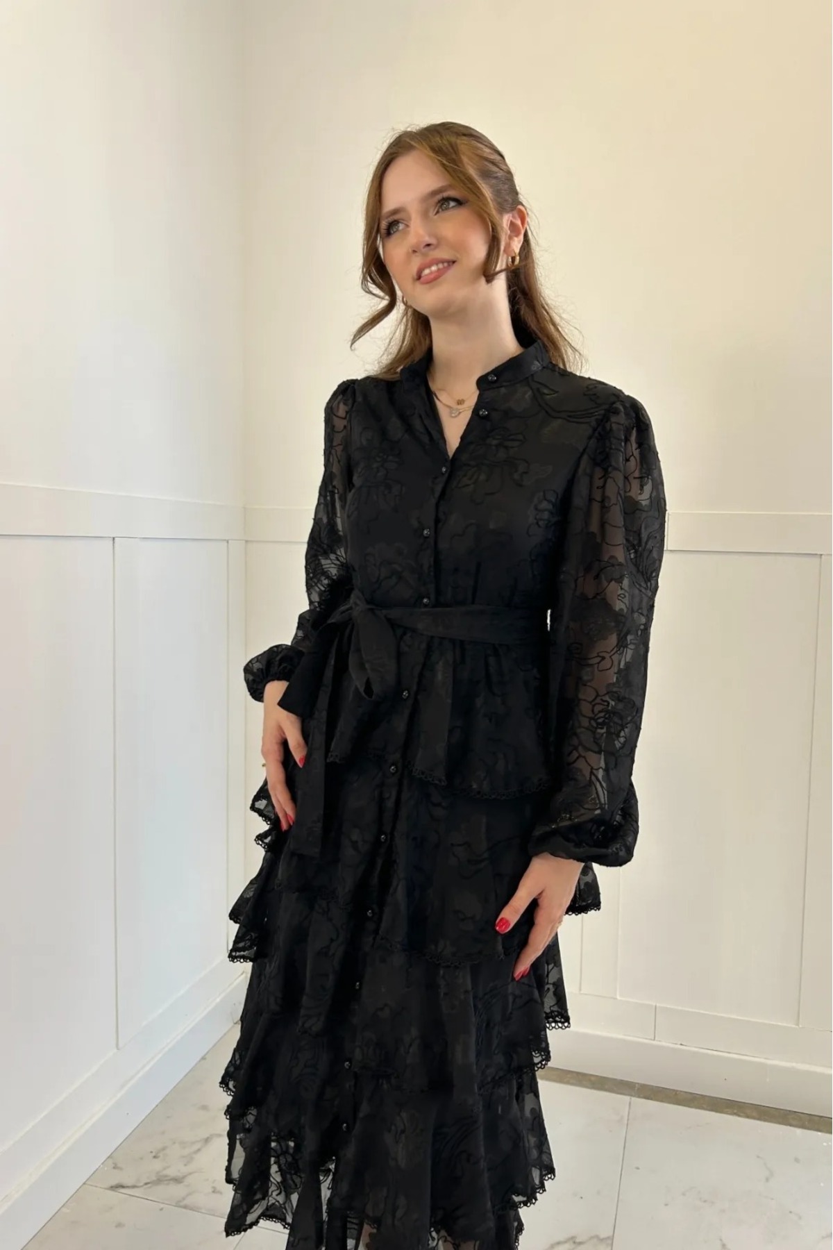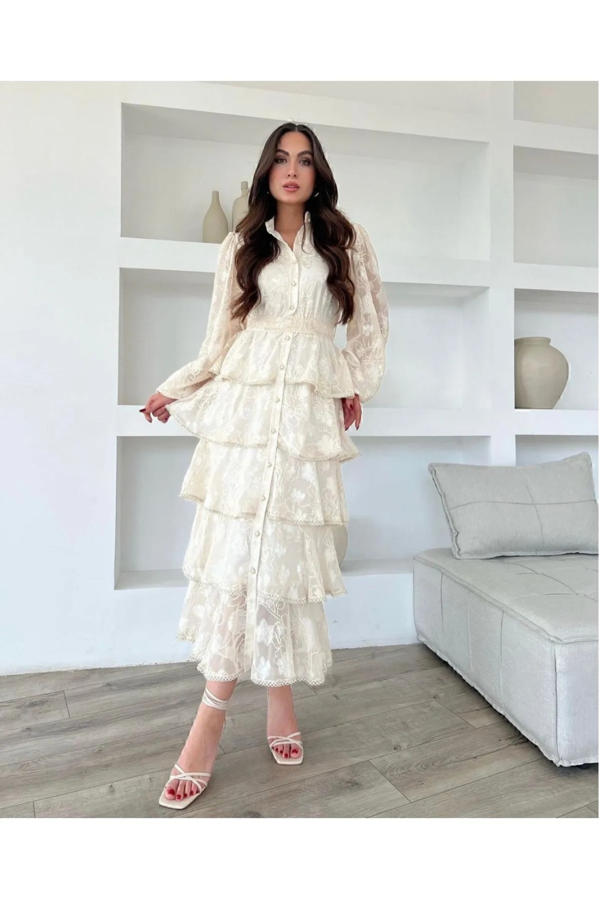 Volanlı Kuşaklı Çiçek Desenli Şerit Detaylı Kat Kat Elbise Volanlı Kuşaklı Çiçek Desenli Şerit Detaylı Kat Kat Elbise AFŞ-EKRVK L