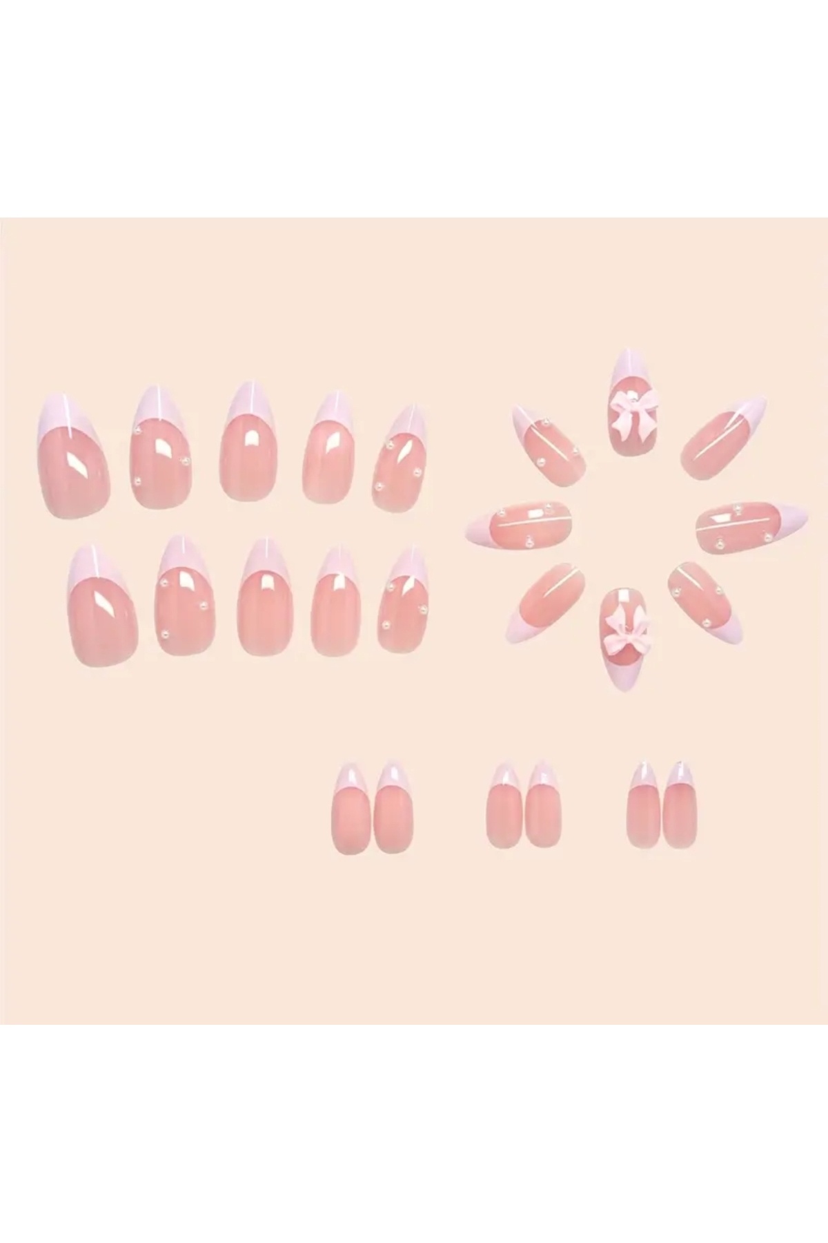 24'lü Pembe Fiyonk ve Taş Charm French Detaylı Jel Protez Görünümlü Takma Tırnak Seti 24'lü Pembe Fiyonk ve Taş Charm French Detaylı Jel Protez Görünümlü Takma Tırnak Seti TKMTRN-51 تک سایز