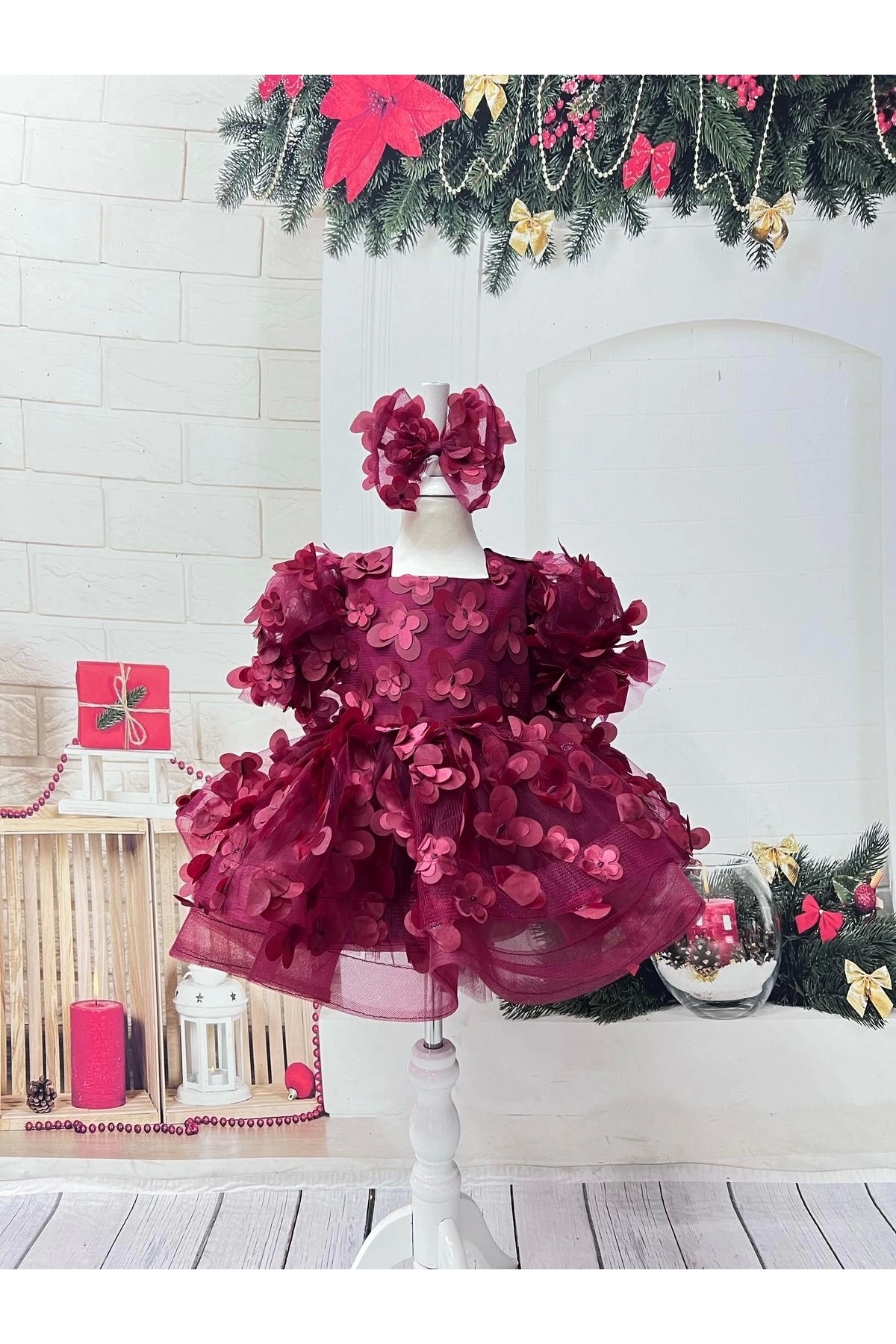 Bordo Çiçek Desenli Kız Çocuk Elbise biye Bordo Çiçek Desenli Kız Çocuk Elbise biye P3291S9375 8 Yaş