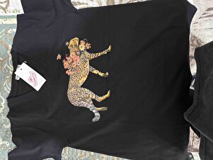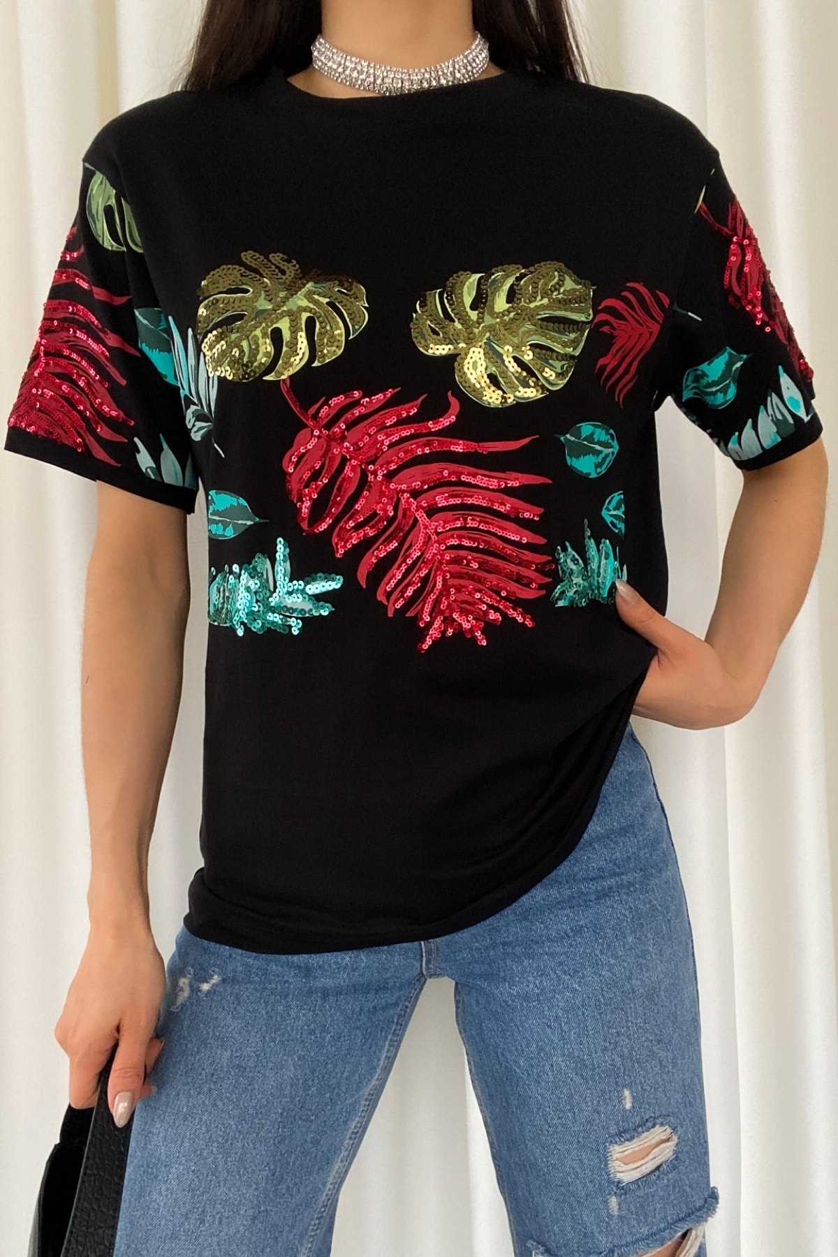 Kadın Siyah V Yaka Leopar Pul Payet İşlemeli %100 Pamuk Tişört Kadın Siyah V Yaka Leopar Pul Payet İşlemeli %100 Pamuk Tişört FEM27 L