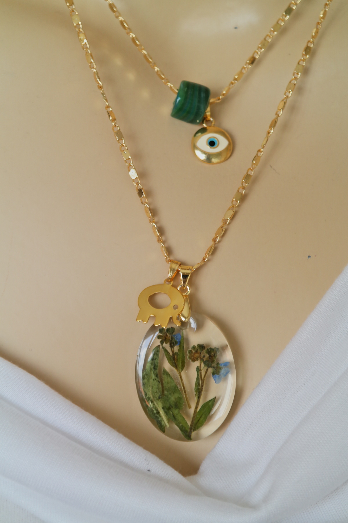 Gerçek Mavi Dal Çıtır Çiçekler Ebruli Yeşil Cam Boncuk Gold Fil ve Nazar Tasarım İkili Kolye Gerçek Mavi Dal Çıtır Çiçekler Ebruli Yeşil Cam Boncuk Gold Fil ve Nazar Tasarım İkili Kolye 8133 تک سایز