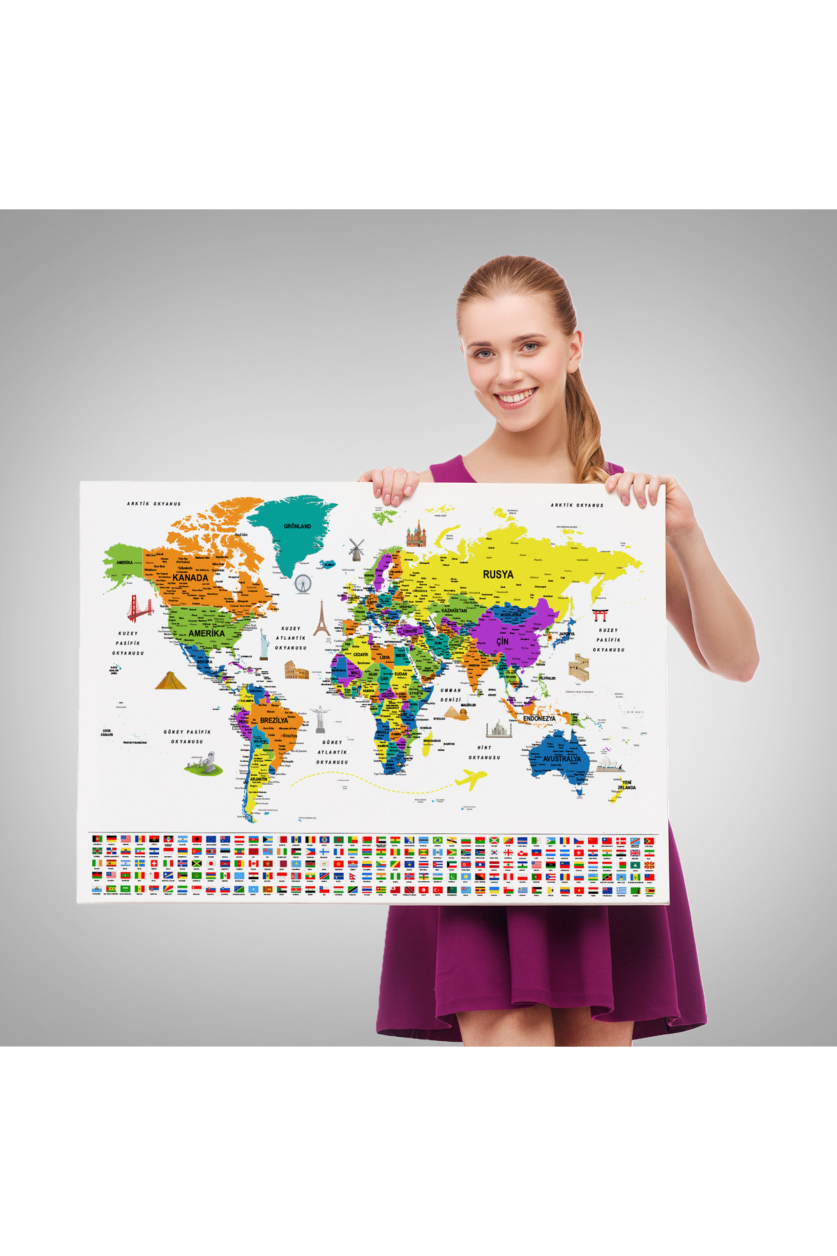 Türkçe Dünya Haritası Ayrıntılı Eğitici Sembollü Bayraklı Dekoratif Kanvas Tablo Türkçe Dünya Haritası Ayrıntılı Eğitici Sembollü Bayraklı Dekoratif Kanvas Tablo LA-hs-2832-2 150 x 255