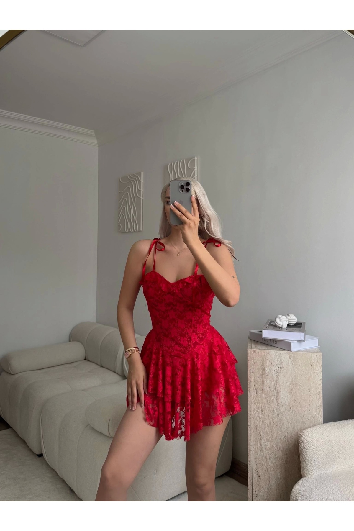 Şortlu Bel Korse Dantel Elbise - KIRMIZI Şortlu Bel Korse Dantel Elbise - KIRMIZI P2803S3176 L