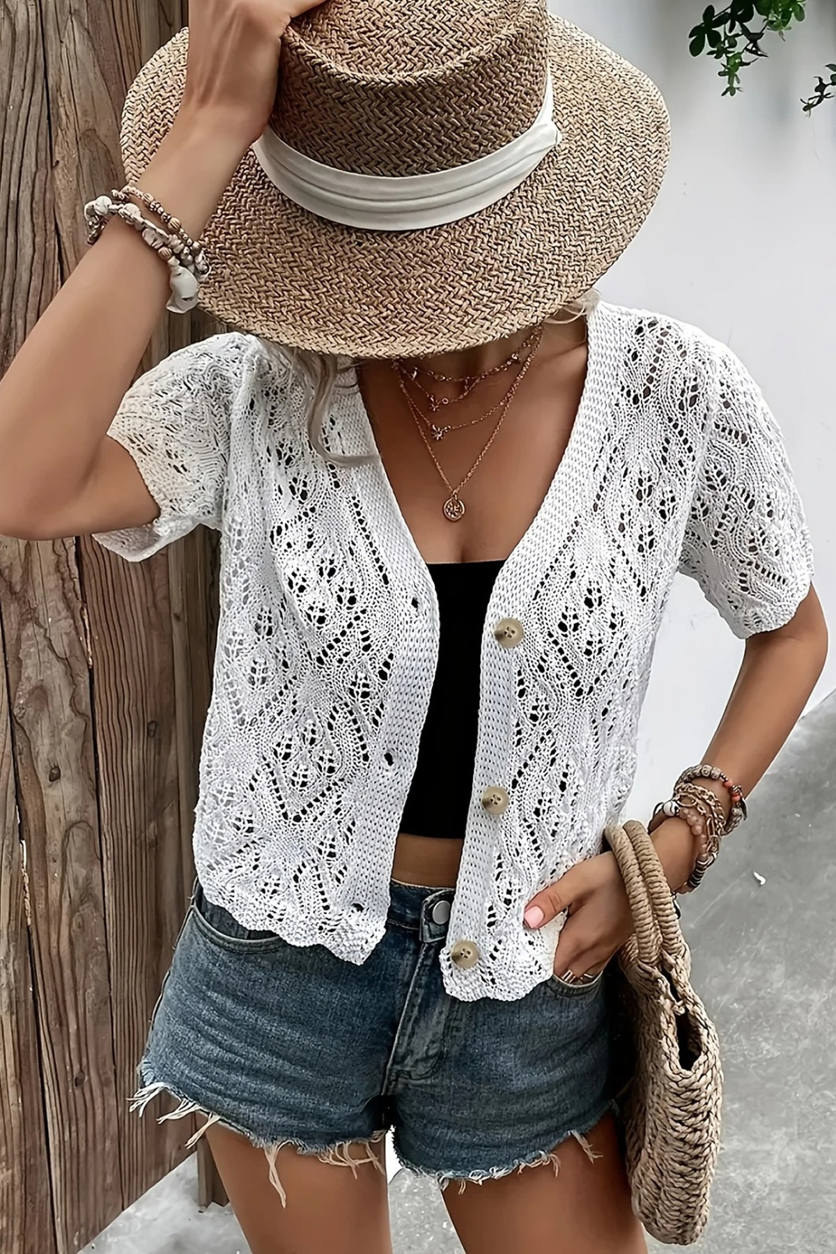 Kısa Kollu Ajurlu Yazlık Düğmeli V Yaka Örgü Hırka VİZON Kısa Kollu Ajurlu Yazlık Düğmeli V Yaka Örgü Hırka VİZON 22300 2XL