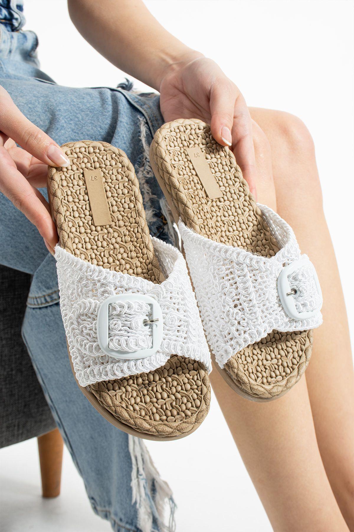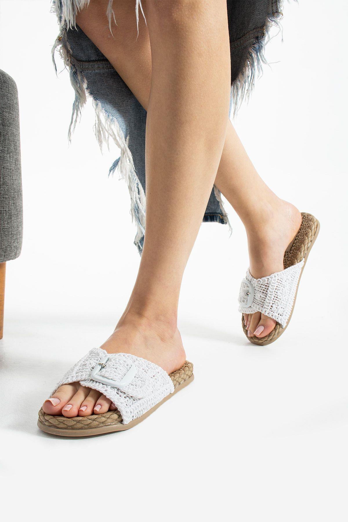 Beyaz Örgü Tokalı Kadın Terlik Kaymaz Taban Havuz Deniz Plaj Terliği Beyaz Örgü Tokalı Kadın Terlik Kaymaz Taban Havuz Deniz Plaj Terliği MD23016 40