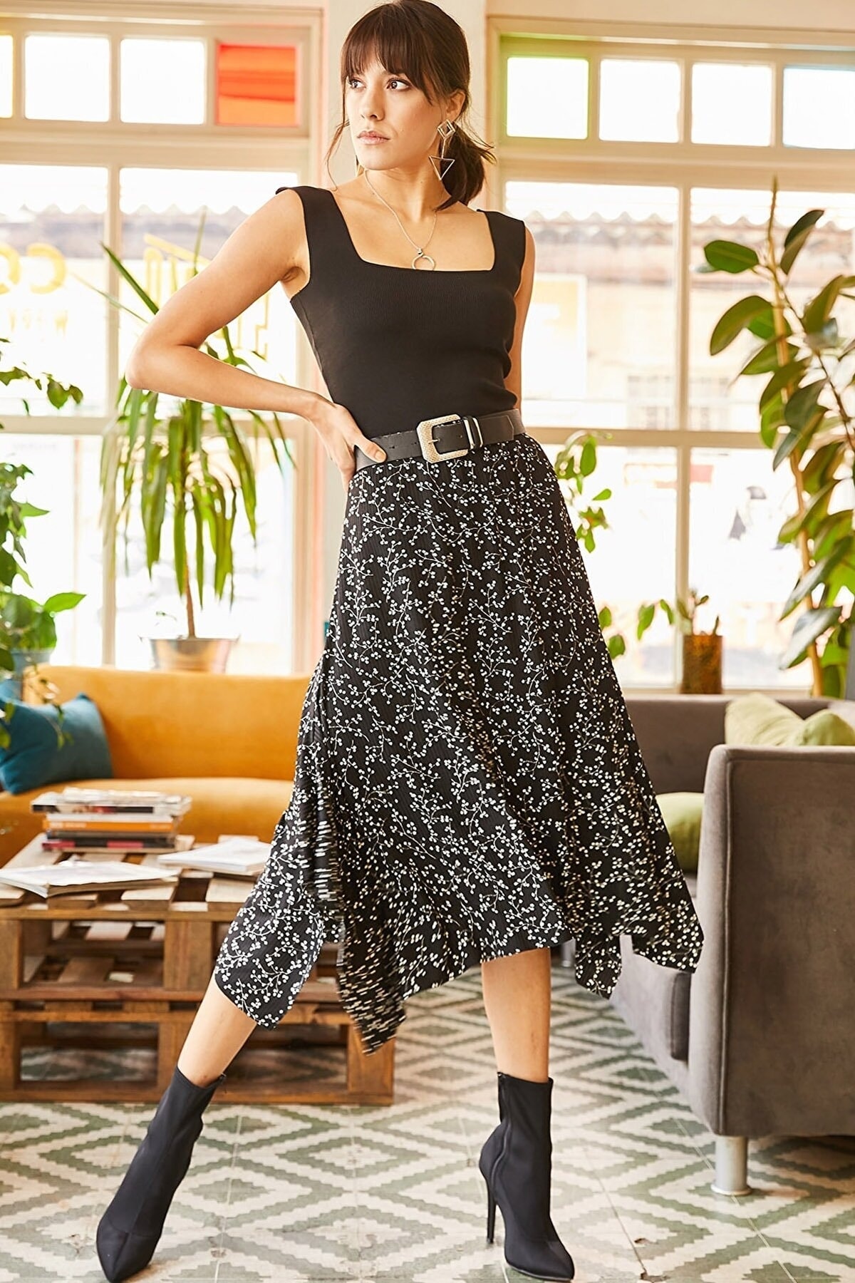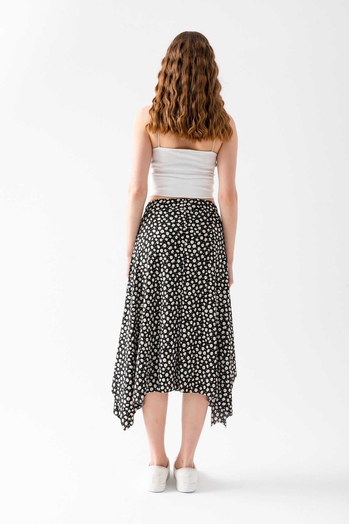 Kadın Siyah Papatya Çiçek Desenli Asimetrik Kesim Midi Boy Volanlı Asimetrik Etek Kadın Siyah Papatya Çiçek Desenli Asimetrik Kesim Midi Boy Volanlı Asimetrik Etek CNR-ASM-001 XL