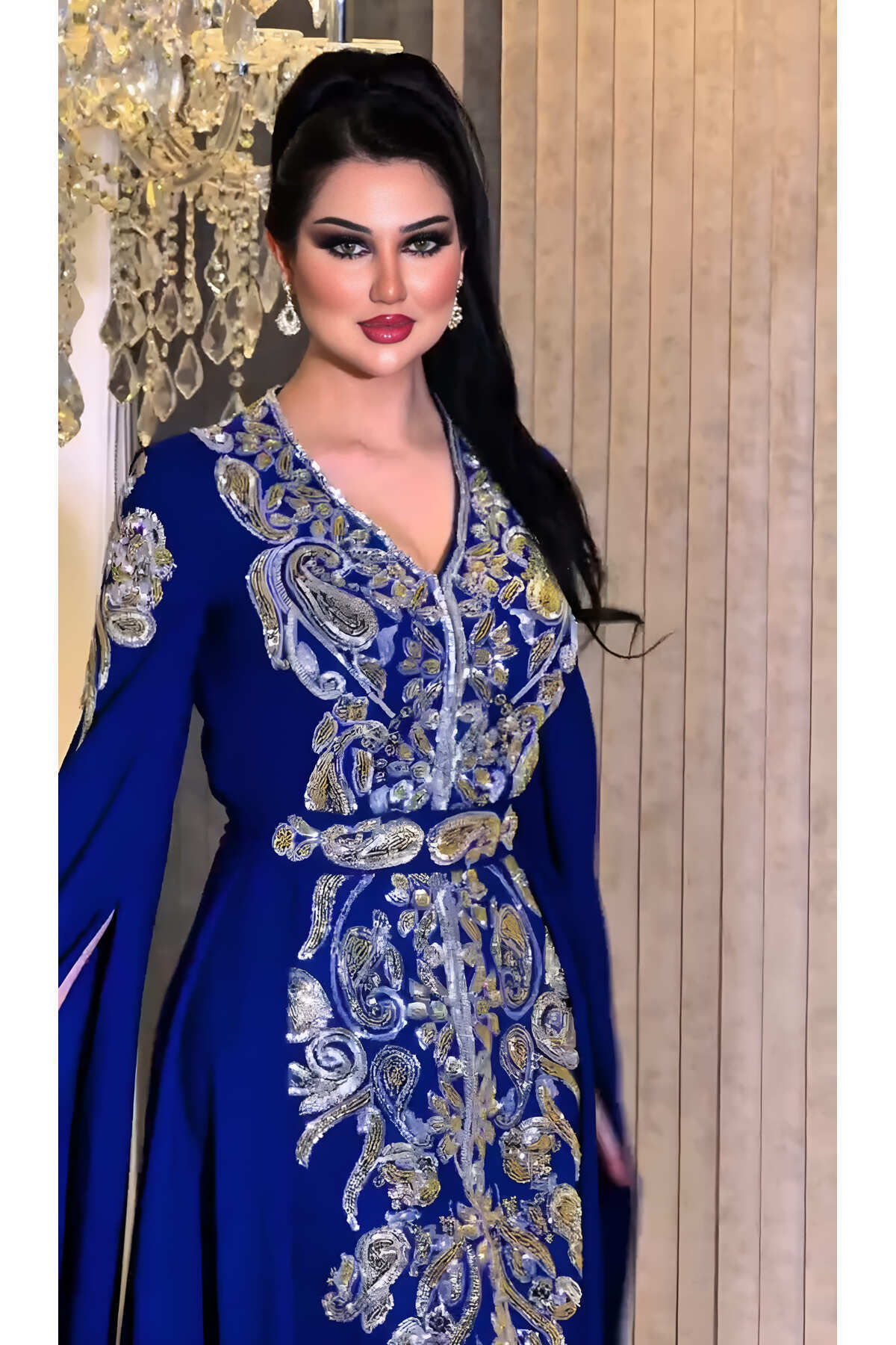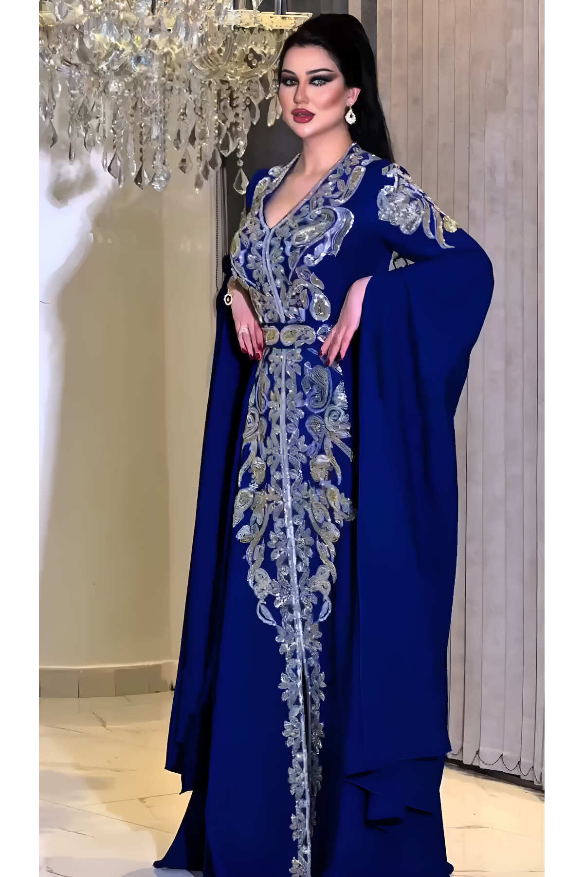 Krep Kumaş, Altın Renk İşlemeli, V Yaka, Yarasa Kollu, Abiye Krep Kumaş, Altın Renk İşlemeli, V Yaka, Yarasa Kollu, Abiye 990406 52
