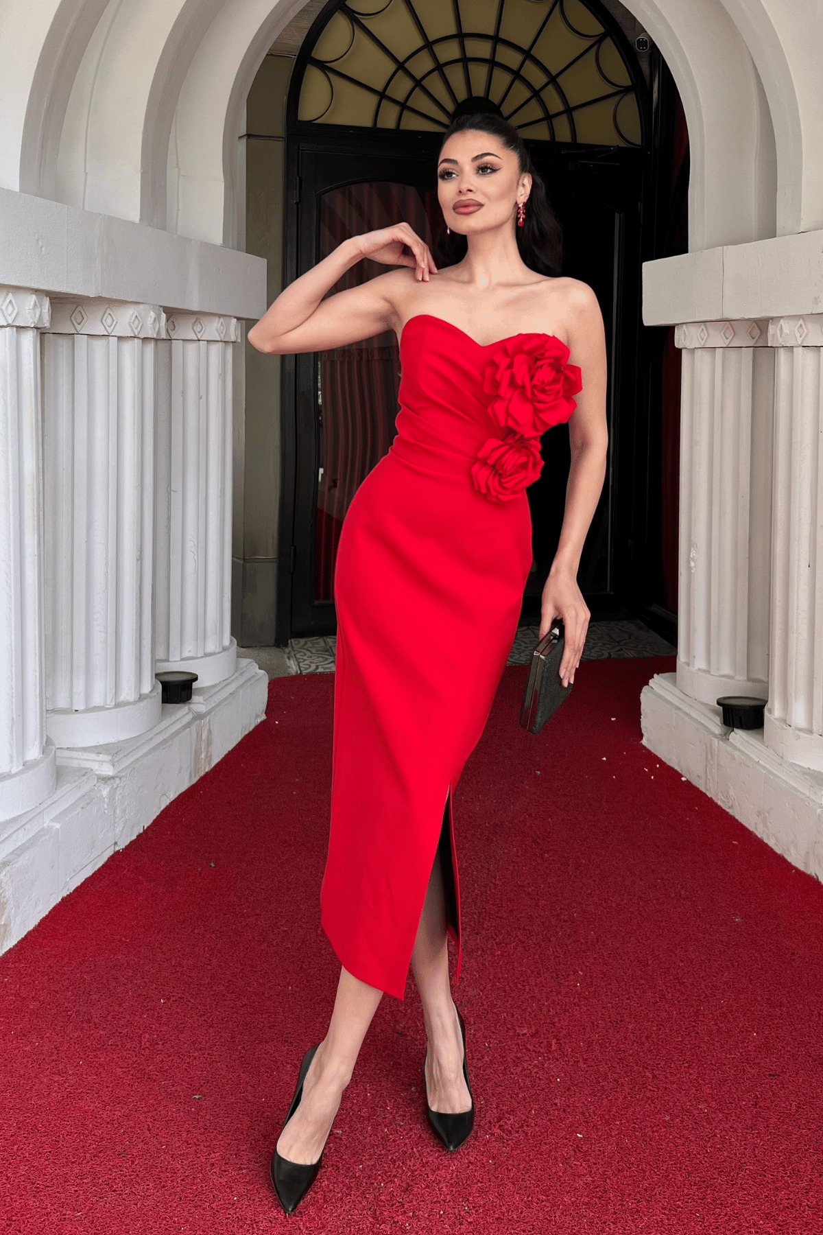 Atlas Kumaş Gül Detaylı Straplez Kalem Elbise - KIRMIZI Atlas Kumaş Gül Detaylı Straplez Kalem Elbise - KIRMIZI GYM-00103 42