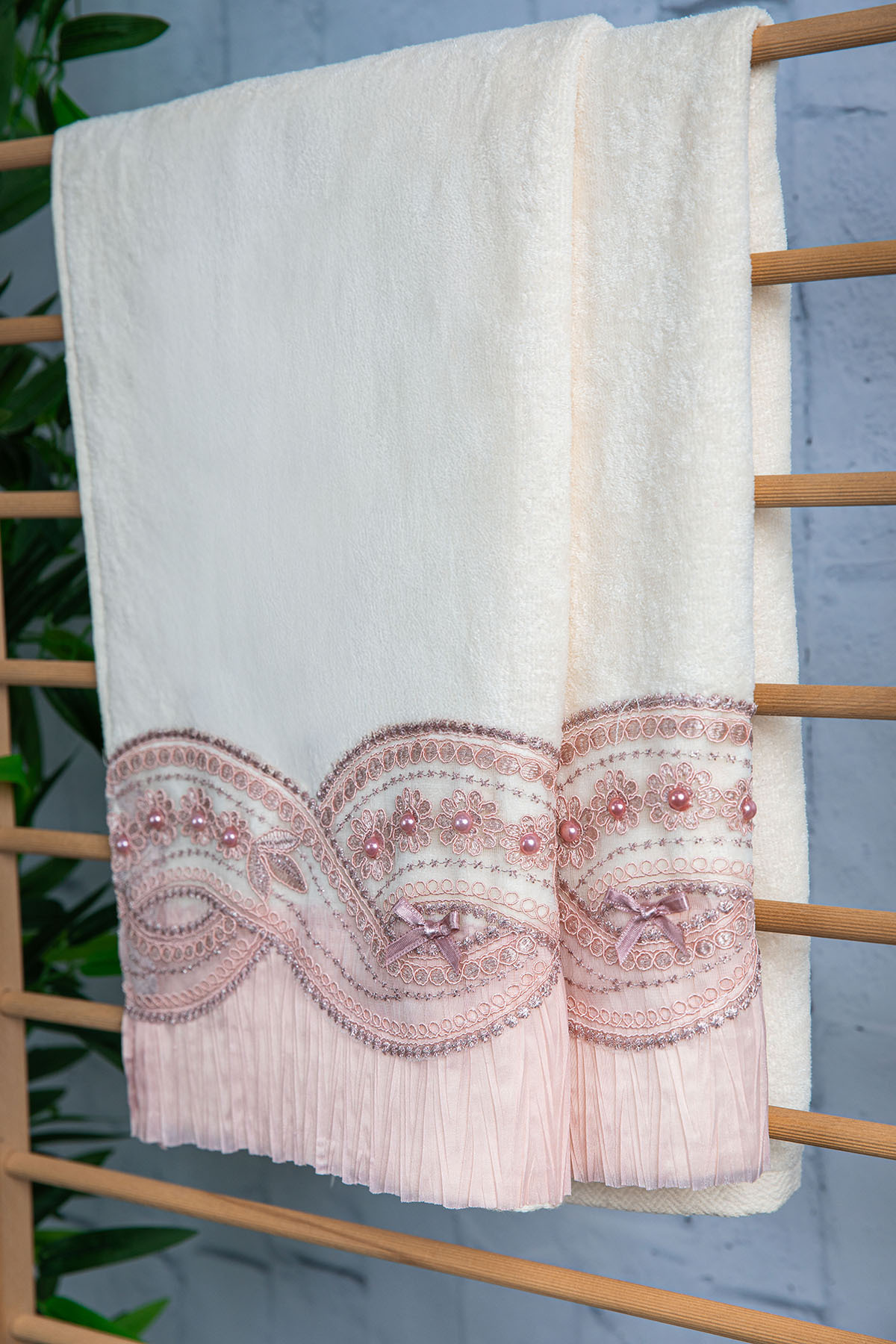 %100 Pamuk Fiyonk Güpürlü Çeyizlik 2'li Havlu 50x90 - Pudra %100 Pamuk Fiyonk Güpürlü Çeyizlik 2'li Havlu 50x90 - Pudra F2434 تک سایز