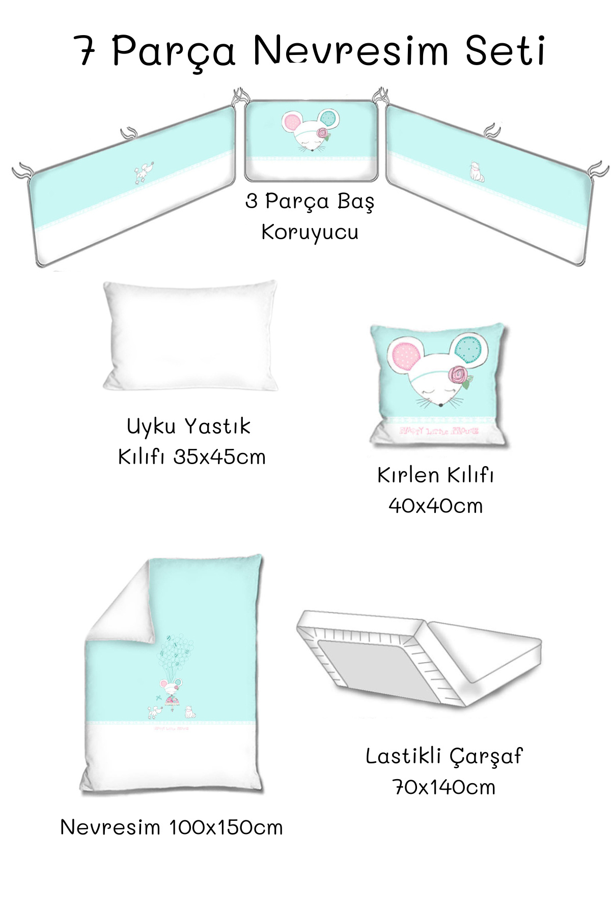 Bebek 7li Uyku Seti %100 Pamuk 100x150cm Mint Dolly Nevresim Takımı 70x140 Lastikli Çarşaf Bebek 7li Uyku Seti %100 Pamuk 100x150cm Mint Dolly Nevresim Takımı 70x140 Lastikli Çarşaf SYD-NEVSET-7 تک سایز