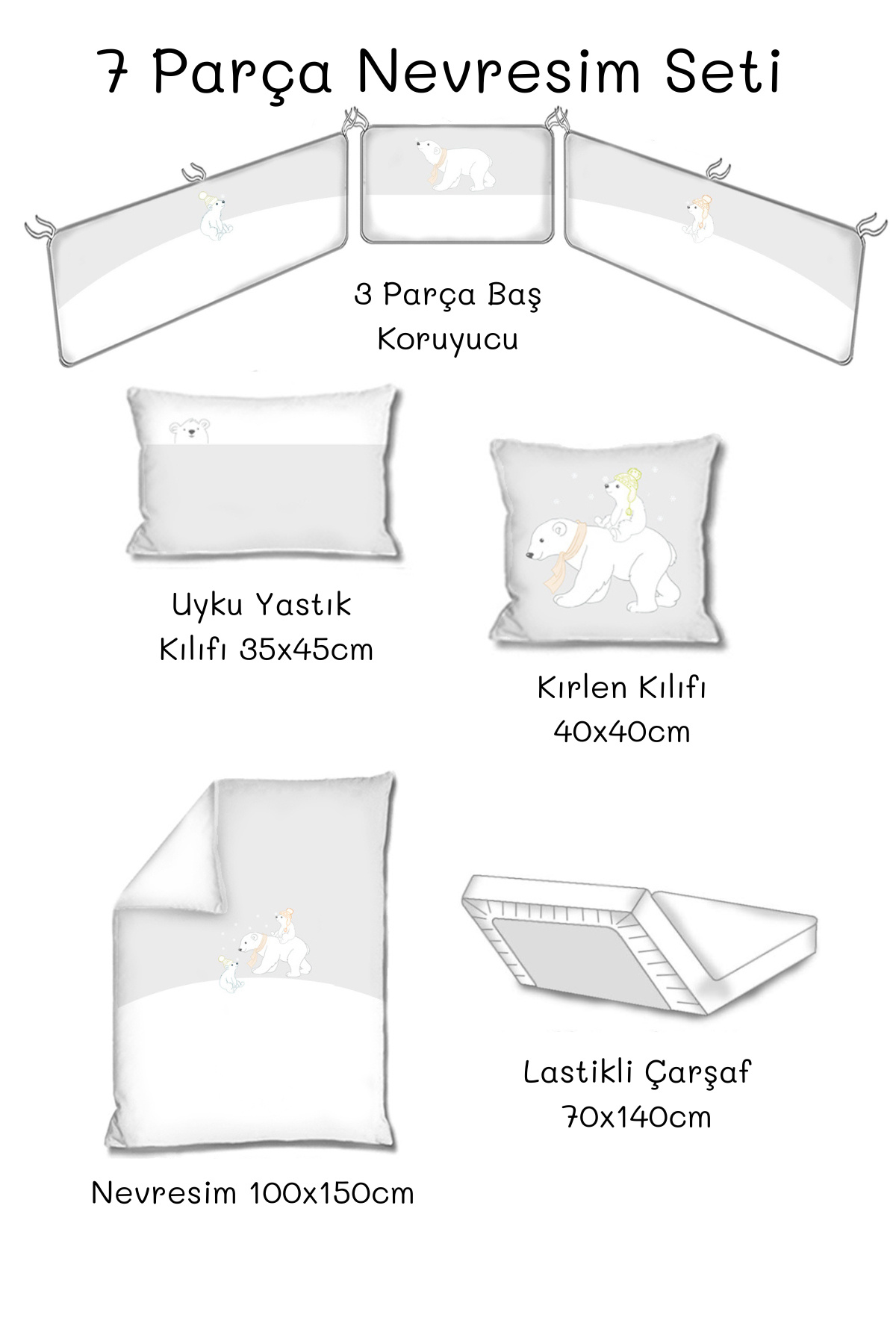 Bebek 7li Uyku Seti %100 Pamuk 100x150cm Gri White Bears Nevresim Takımı 70x140 Lastikli Çarşaf Bebek 7li Uyku Seti %100 Pamuk 100x150cm Gri White Bears Nevresim Takımı 70x140 Lastikli Çarşaf SYD-NEVSET-7 تک سایز