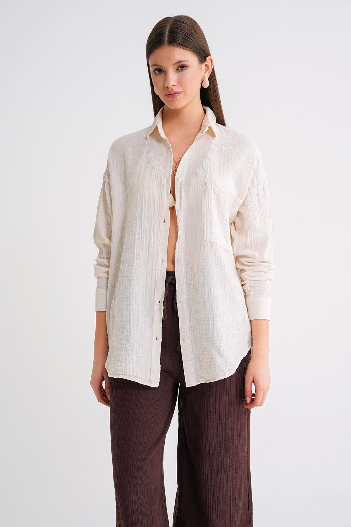 4670 Kadın Cepli Oversize Basic Keten Gömlek Beyaz 4670 Kadın Cepli Oversize Basic Keten Gömlek Beyaz Y25GML4670 L