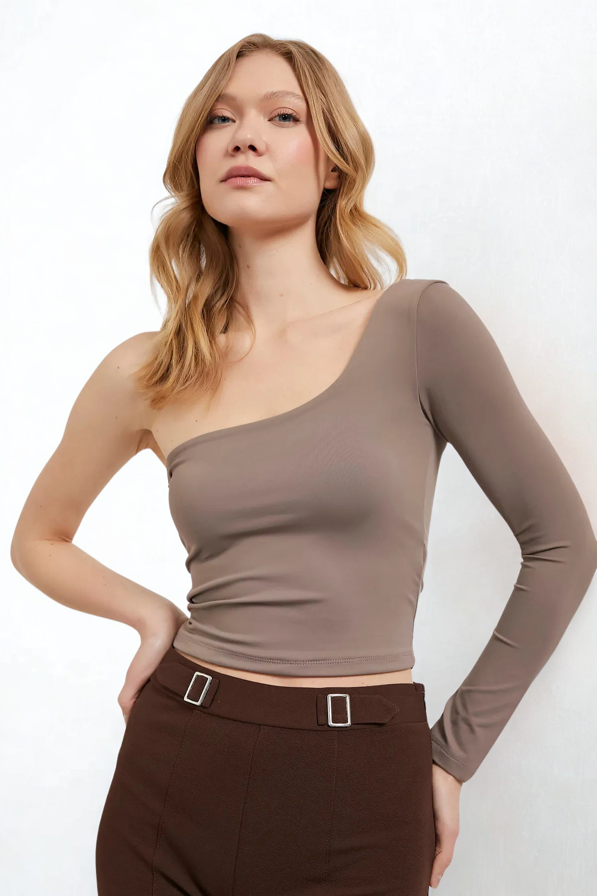 Kadın Tek Kol Omzu Açık Dar Basic Vizon Crop Body Kadın Tek Kol Omzu Açık Dar Basic Vizon Crop Body 589-5YB1803BDY L