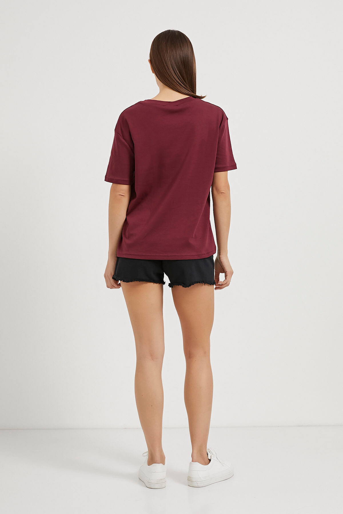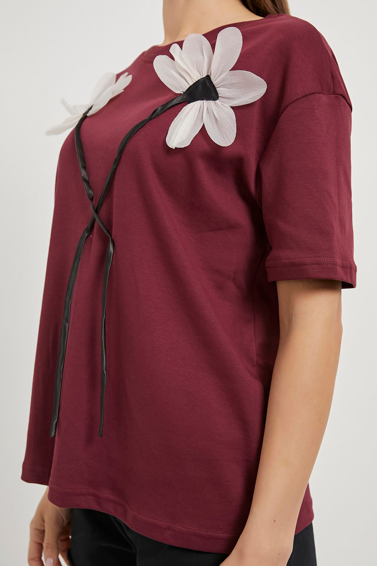 Kadın Çiçek Aksesuarlı Bisiklet Yaka Bordo Tişört Kadın Çiçek Aksesuarlı Bisiklet Yaka Bordo Tişört 155-5YB3246TSH L
