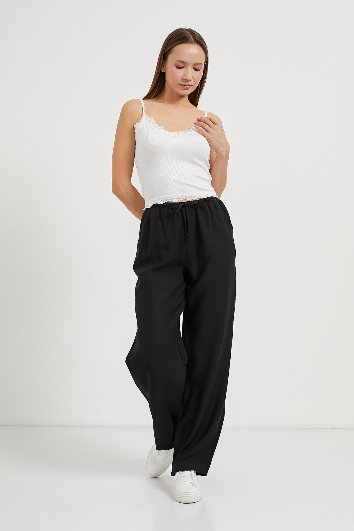 Kadın İnce Askılı Dantelli Yazlık Beyaz Crop Bluz Kadın İnce Askılı Dantelli Yazlık Beyaz Crop Bluz 475-5YB1414ATL L