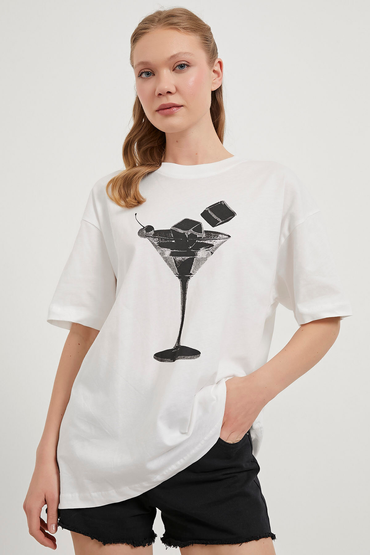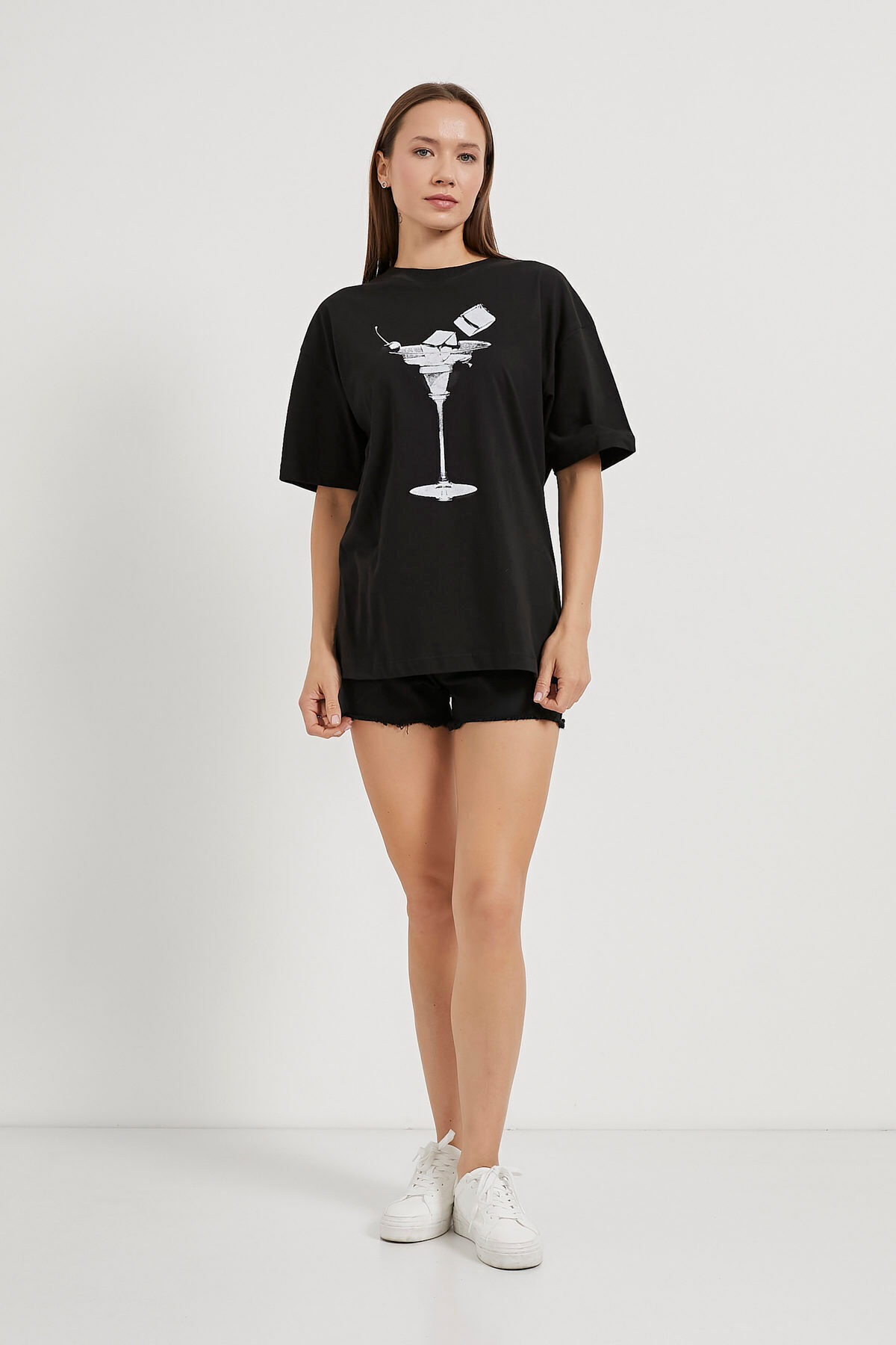 Kadın Kadeh Baskılı Bisiklet Yaka Bol Siyah Tişört Kadın Kadeh Baskılı Bisiklet Yaka Bol Siyah Tişört 544-5YB2978TSH L
