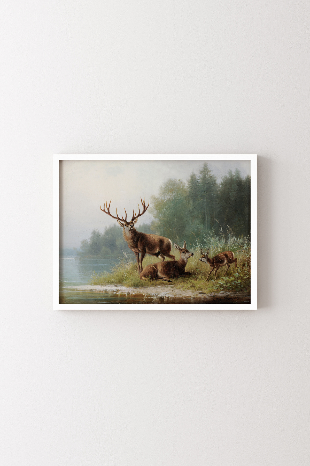 Göl Kenarında Geyikler - Ahşap Desenli Çerçeve Göl Kenarında Geyikler - Ahşap Desenli Çerçeve epq00134 50 x 70
