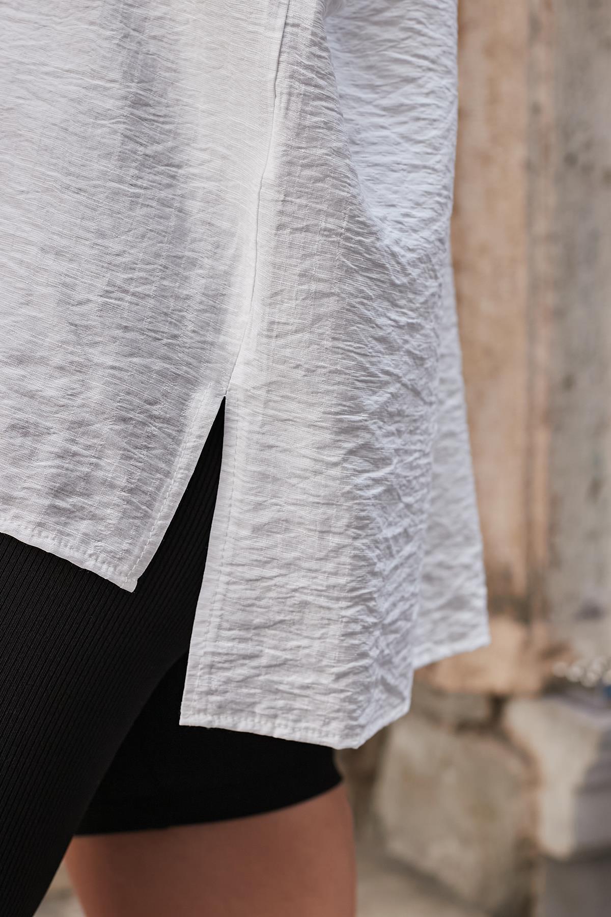 Kadın Likrasız Keten Kumaş Yakalı Cepli Düşük Omuzlu Salaş Oversize Tunik Gömlek-Krem Kadın Likrasız Keten Kumaş Yakalı Cepli Düşük Omuzlu Salaş Oversize Tunik Gömlek-Krem 90061 XL