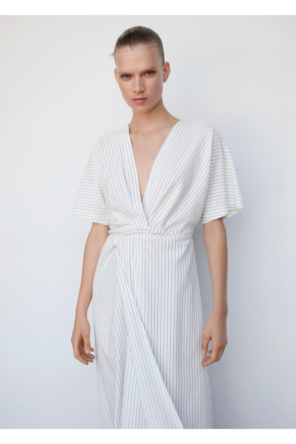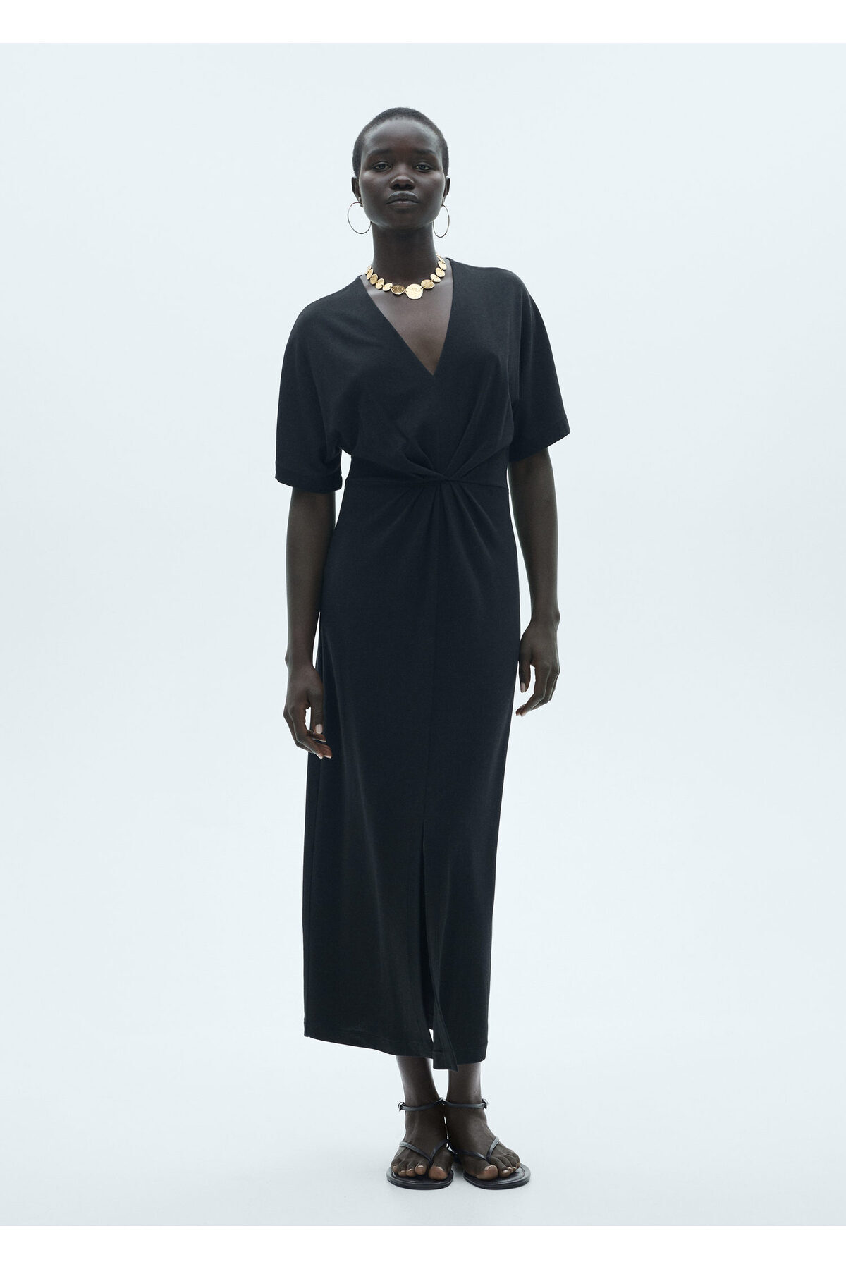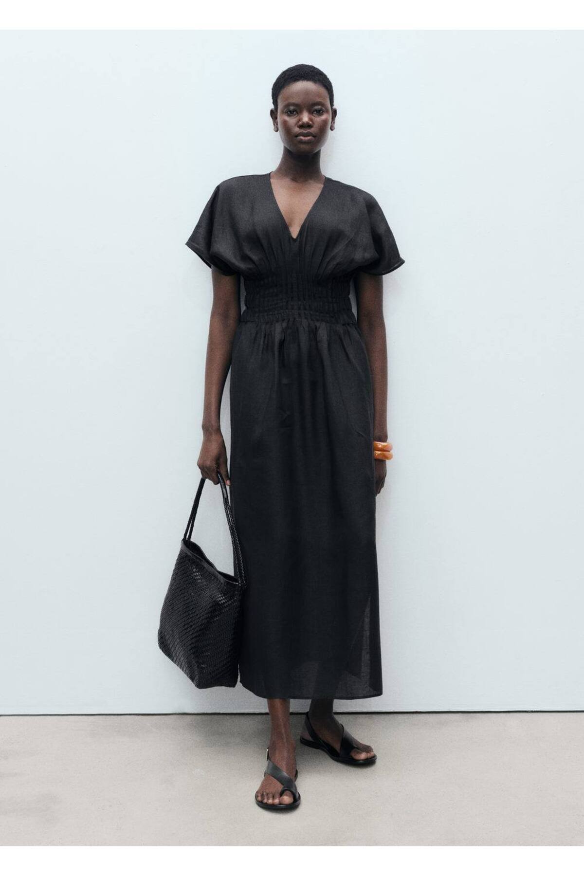 Büzgülü panelli uzun keten elbise Büzgülü panelli uzun keten elbise 87018645 L