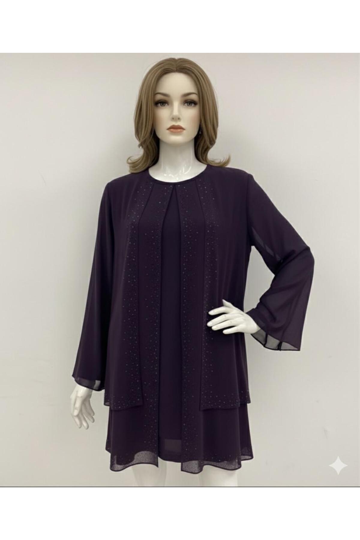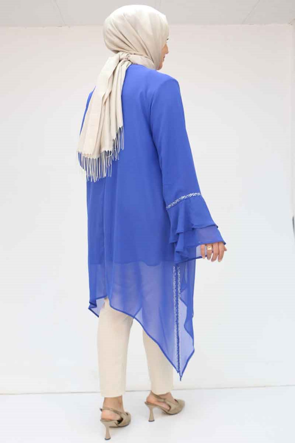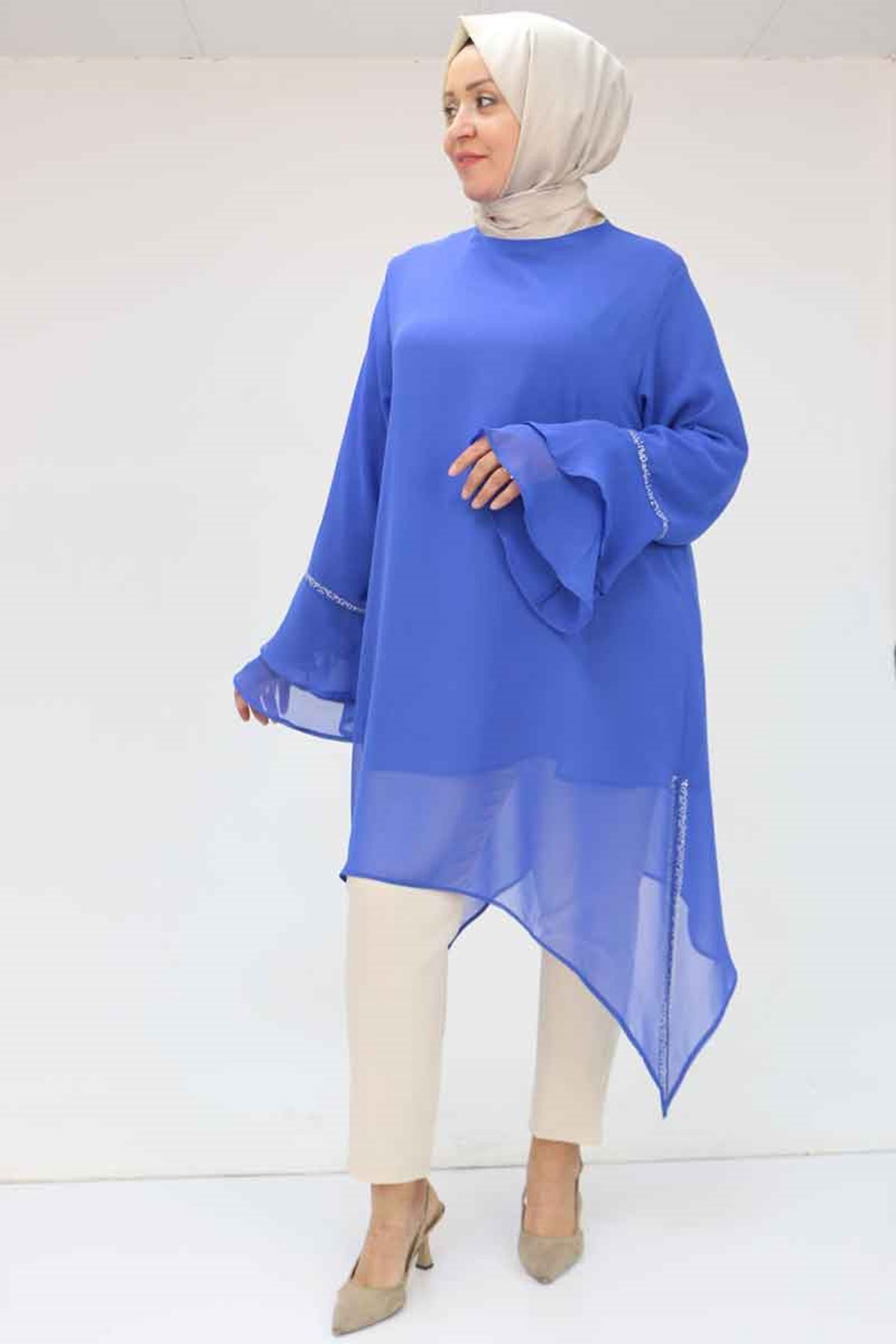 58018 Büyük Beden Kolu Volanlı Taş Baskılı Şifon Tunik - Saks 58018 Büyük Beden Kolu Volanlı Taş Baskılı Şifon Tunik - Saks 9XL