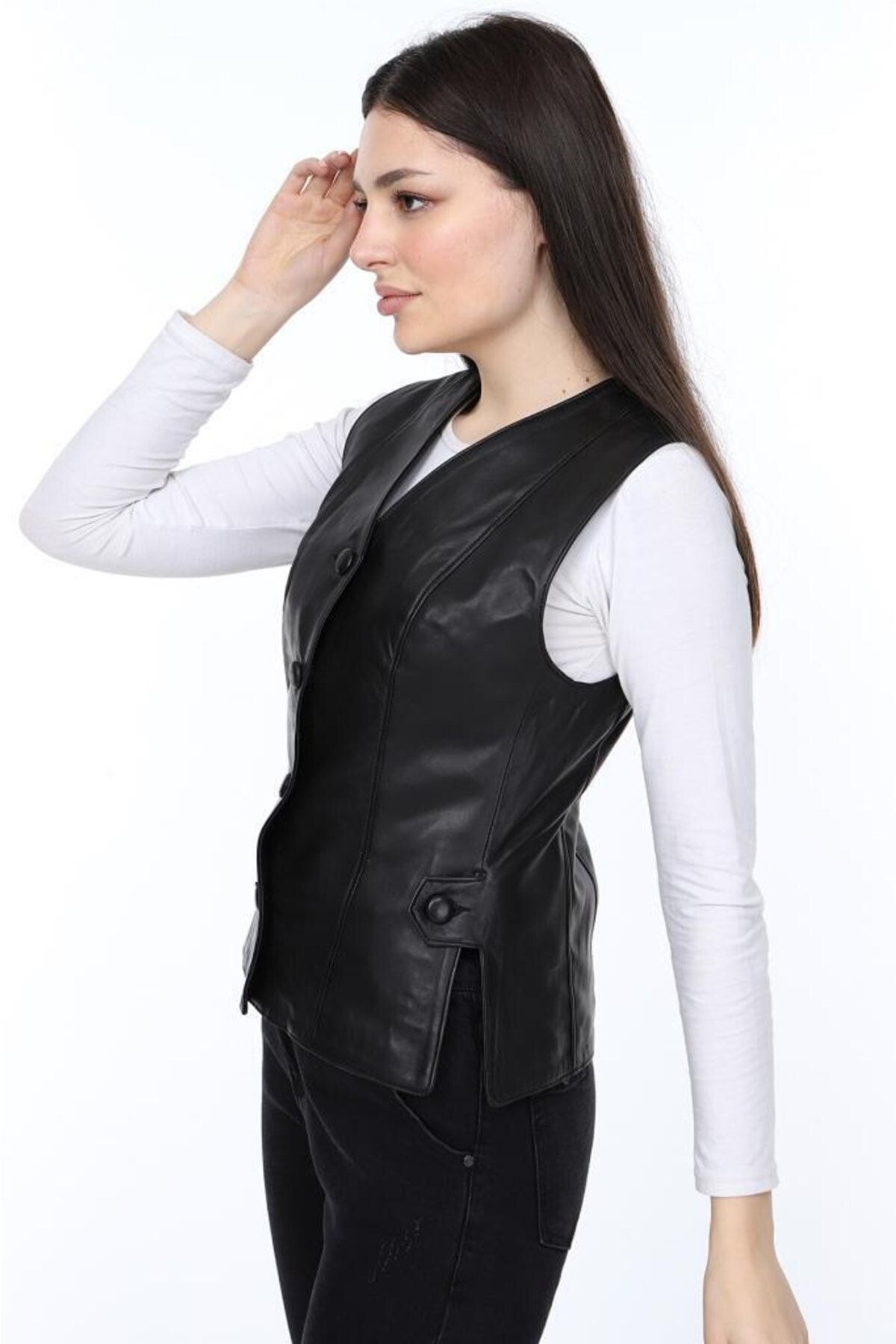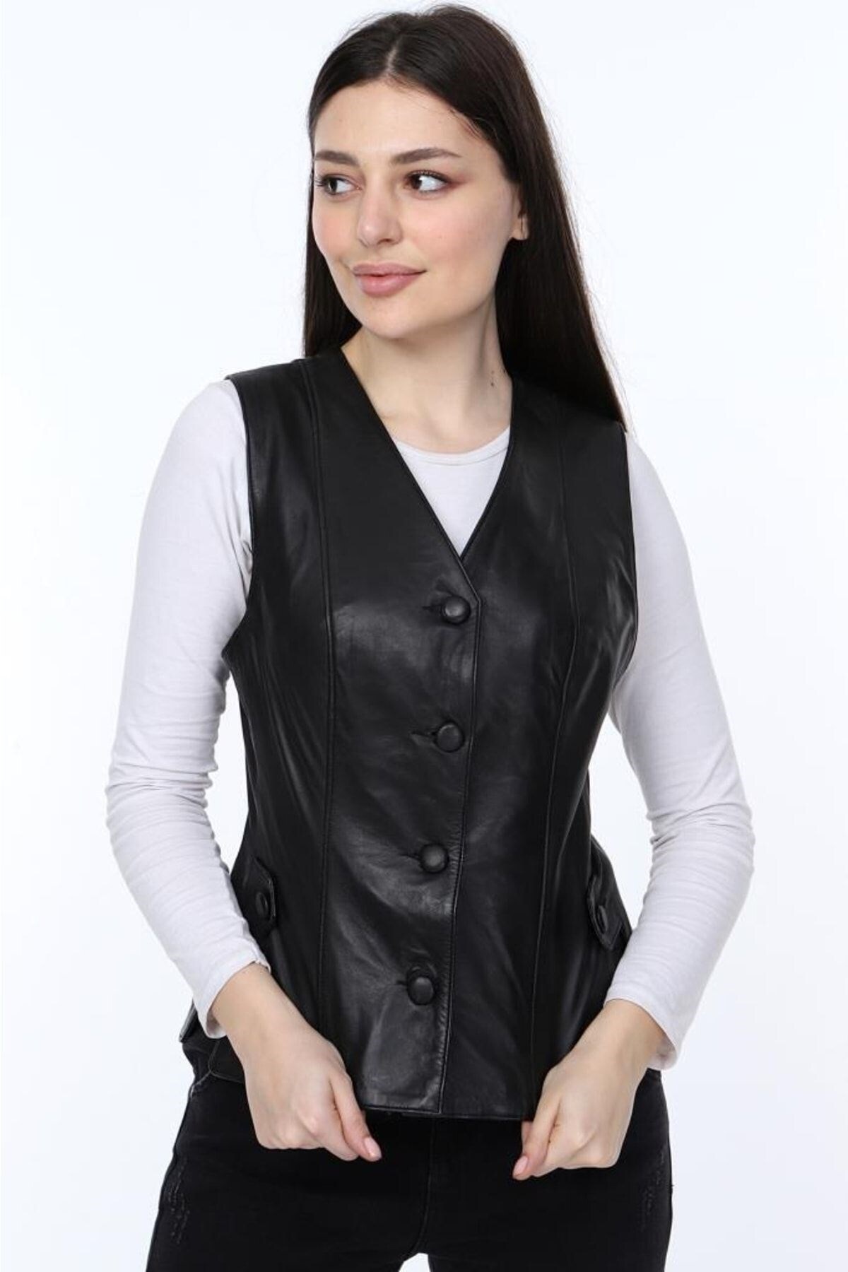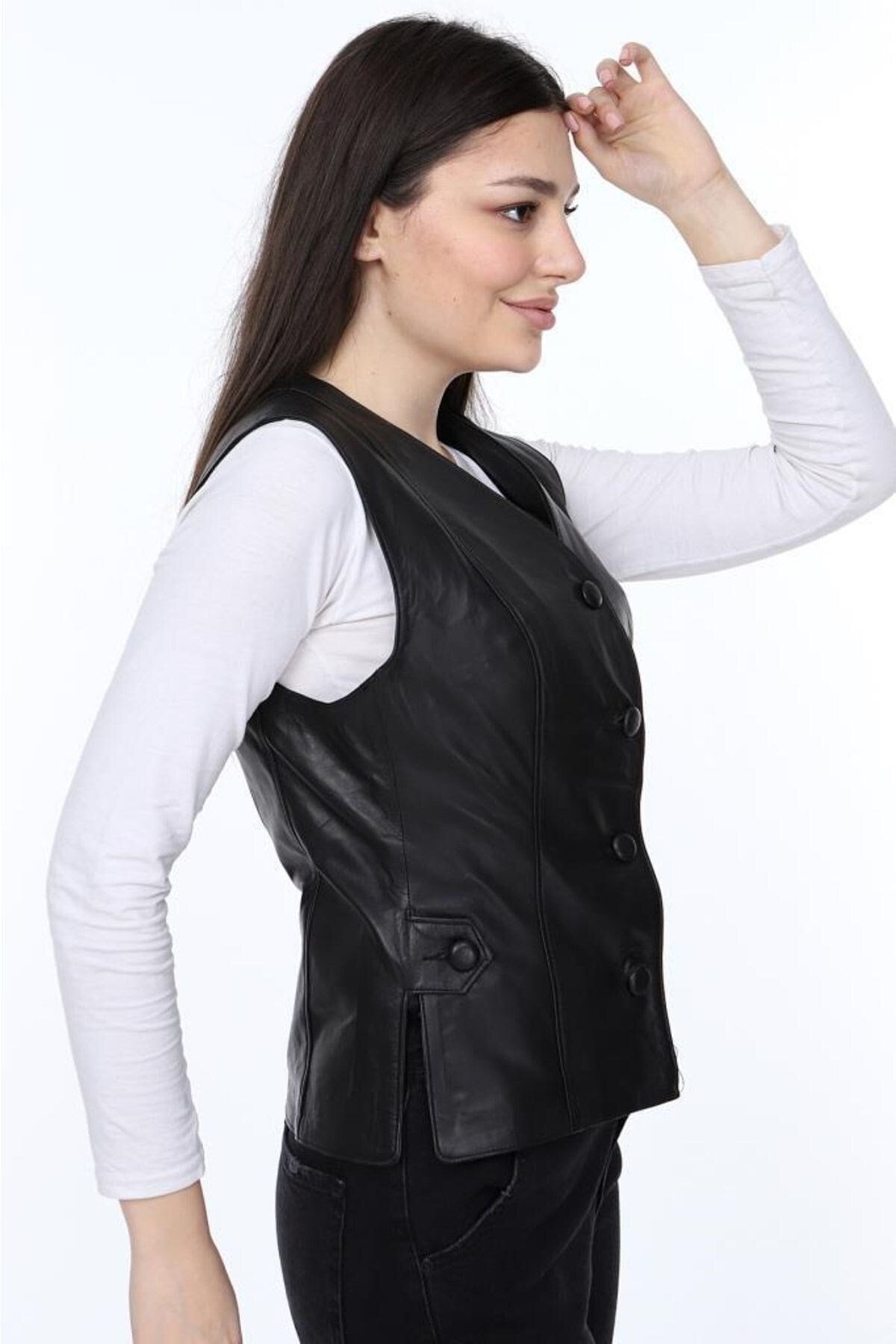 Hakiki Kuzu Derisi Siyah Düğmeli Kadın Yelek Siyah Hakiki Kuzu Derisi Siyah Düğmeli Kadın Yelek Siyah dw-04-00-50 3XL